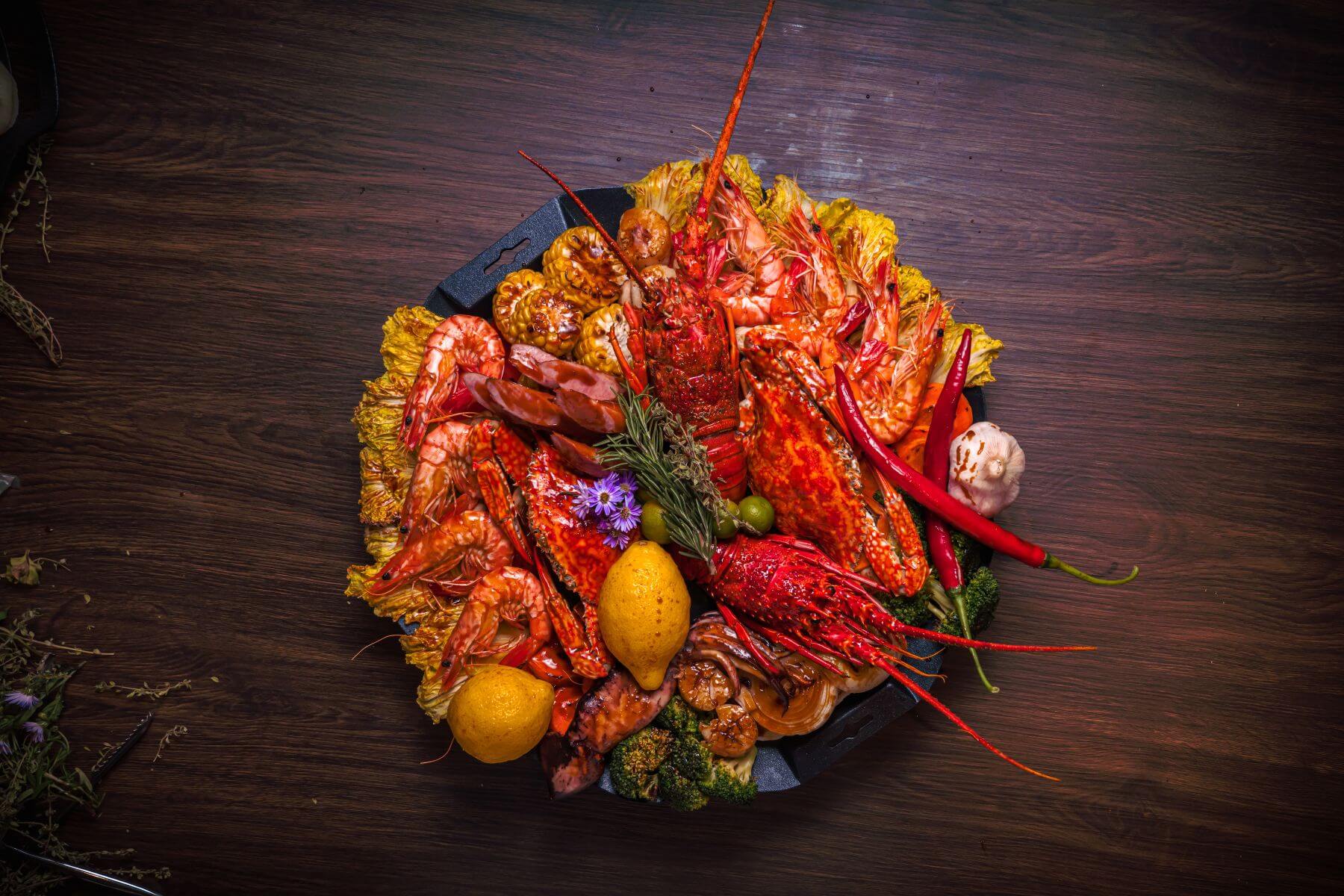 鑄火「海拼盤」:嚴選來自斯里蘭卡的飽滿花蟹、日本的生食級干貝,以及來自馬達加斯加的肥美龍蝦,搭配時令鮮蔬。以最原始的烹調方式,保留海鮮的原汁原味,每一口都能嚐到大海的鮮甜。