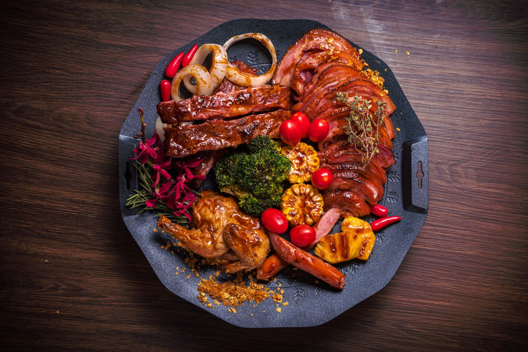 鑄火「陸拼盤」:嚴選多款上等肉品,如肋排、去骨豬腳、德式香腸、烤春雞,佐以當季時蔬,在炙熱的麥飯石岩板上滋滋作響,鎖住肉汁的鮮甜。搭配多種風味獨特的燒烤醬料,讓您體驗多層次的味蕾享受。