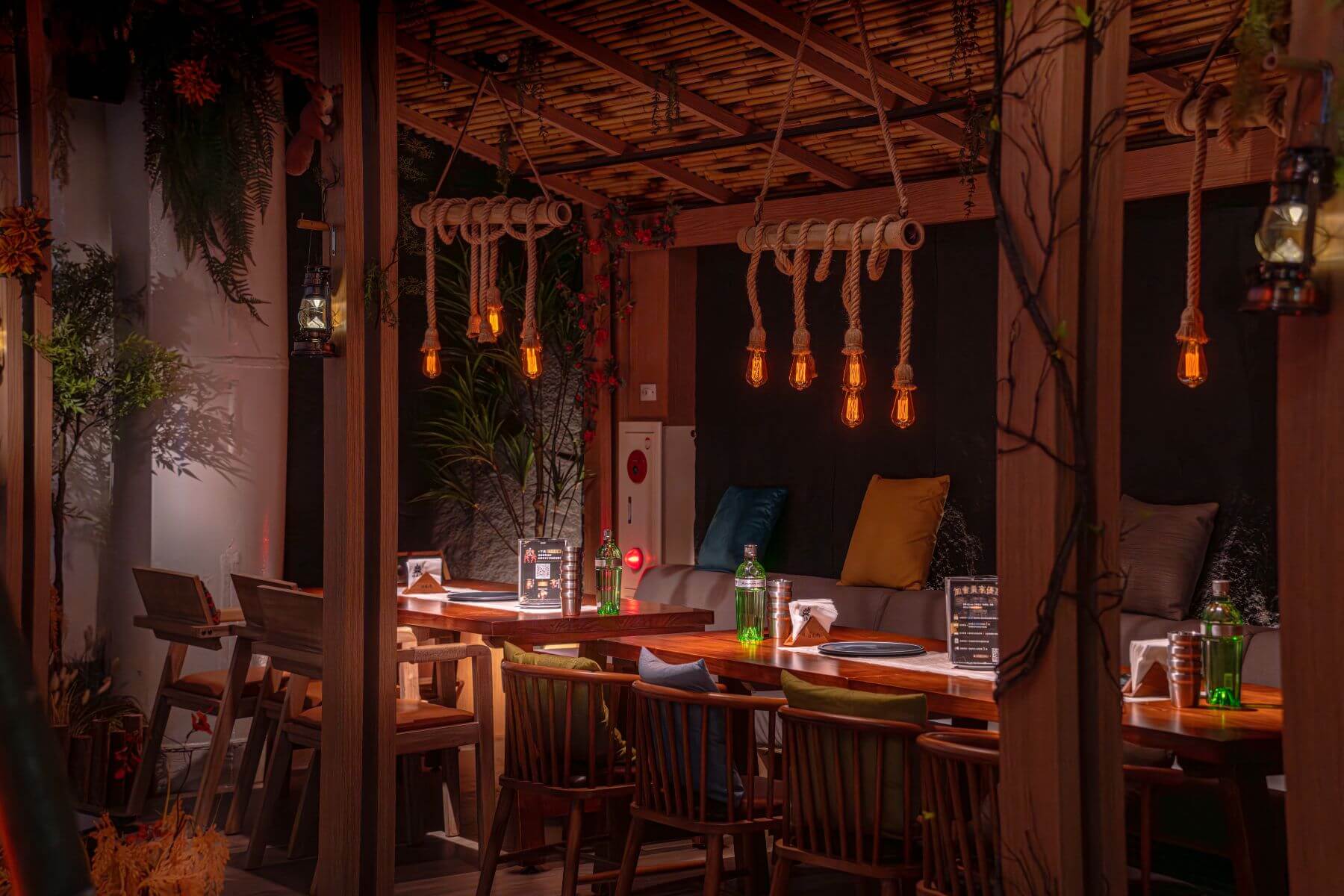 為了更呼應outdoor生活的推廣與實踐,餐廳特別與日本露營品牌VENTLAX合作,將戶外野營周邊搬進室內,使店內營造彷彿置身山林,走進店內,即被綠意盎然的森林氛圍包圍,三角旗幟迎風飄揚,營燈閃爍,搭配精心挑選的自然系音樂與獨特香氛,營造出最愜意的露營體驗。更令人驚豔的是,透過全室投影融接技術,店內座位區彷彿化身一座日夜變換的森林,搭配季節更迭的動態影像,在美食裡感受沉浸式的野營樂趣。
