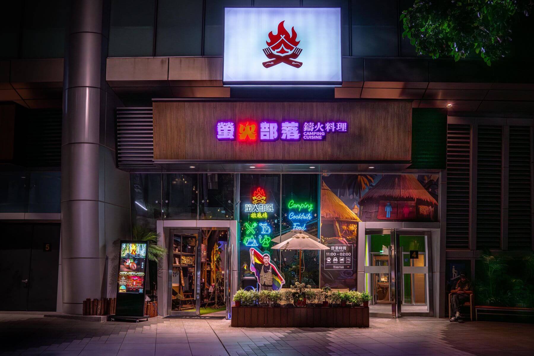 以野營戶外風為主題的餐酒館「放感情螢火部落」,店內環繞投影將呼應四季氣候,並在重要賽事來臨時轉變成大型觀賽螢幕。