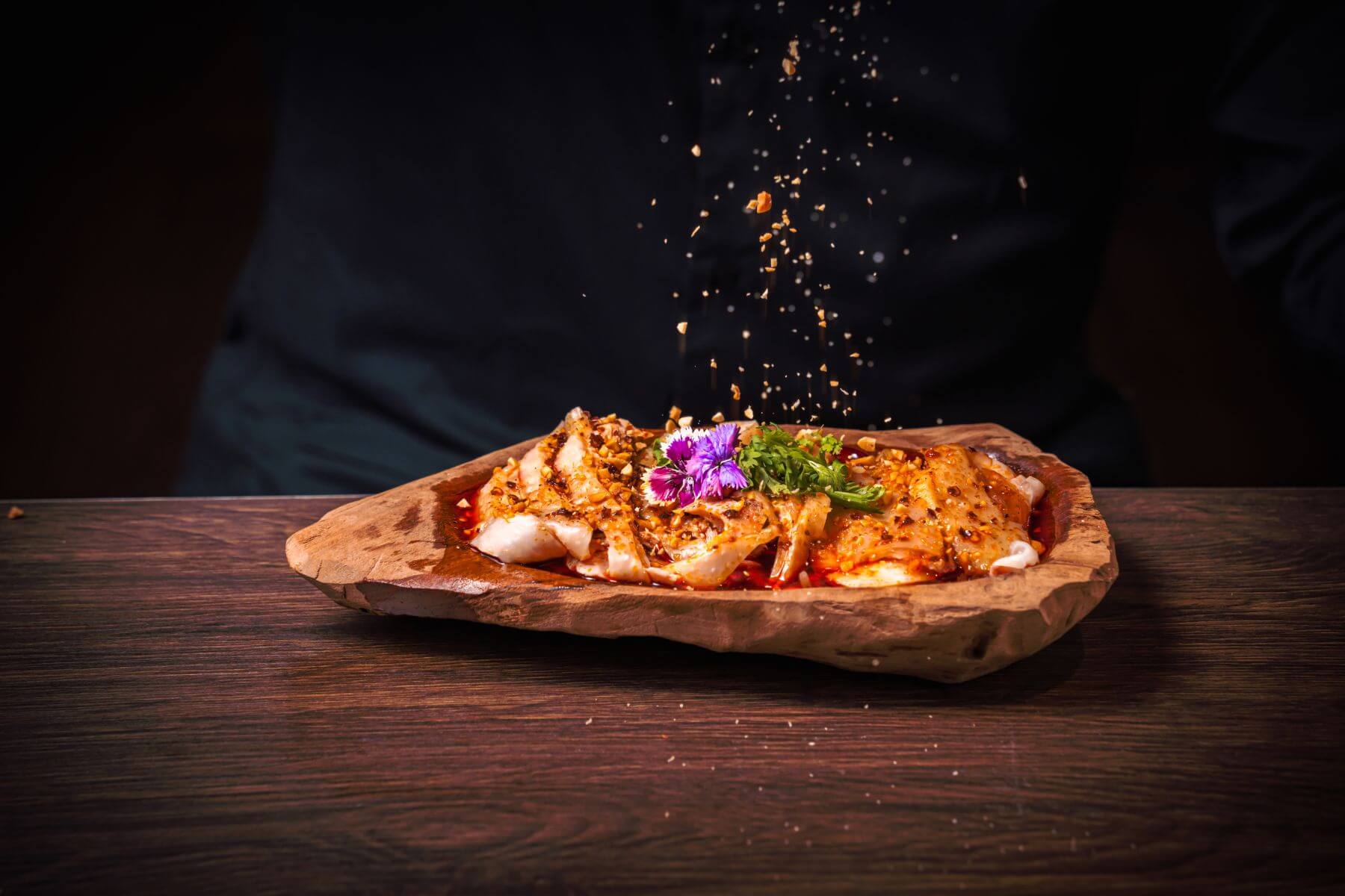 椒麻口水雞:選用台灣土雞腿,以舒肥方式烹煮,肉質鮮嫩多汁。搭配自製的椒麻醬汁,香麻帶勁,冰涼的口感中和了辣椒的熱辣,是炎炎夏日的開胃良品。