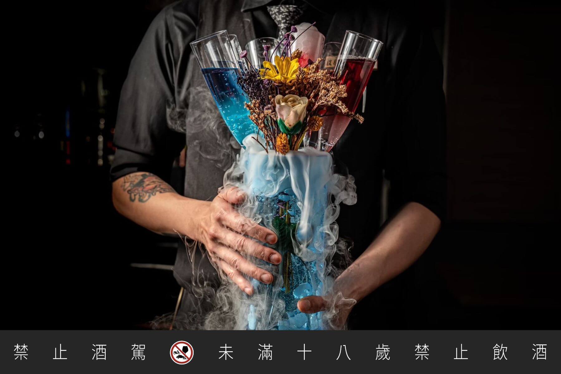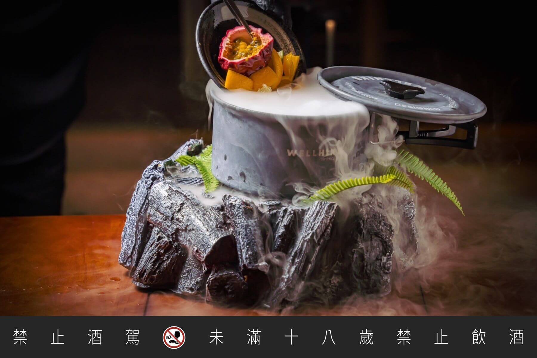 螢火派對鍋:以琴酒、荔枝甜酒及萊姆酒為基底,搭配綠茶、青蘋果和百香果,調製出清新爽口的派對飲品。加入乾冰後,杯中煙霧繚繞,視覺效果十足。酸甜的果香與綠茶的清香完美結合,是派對的最佳選擇。