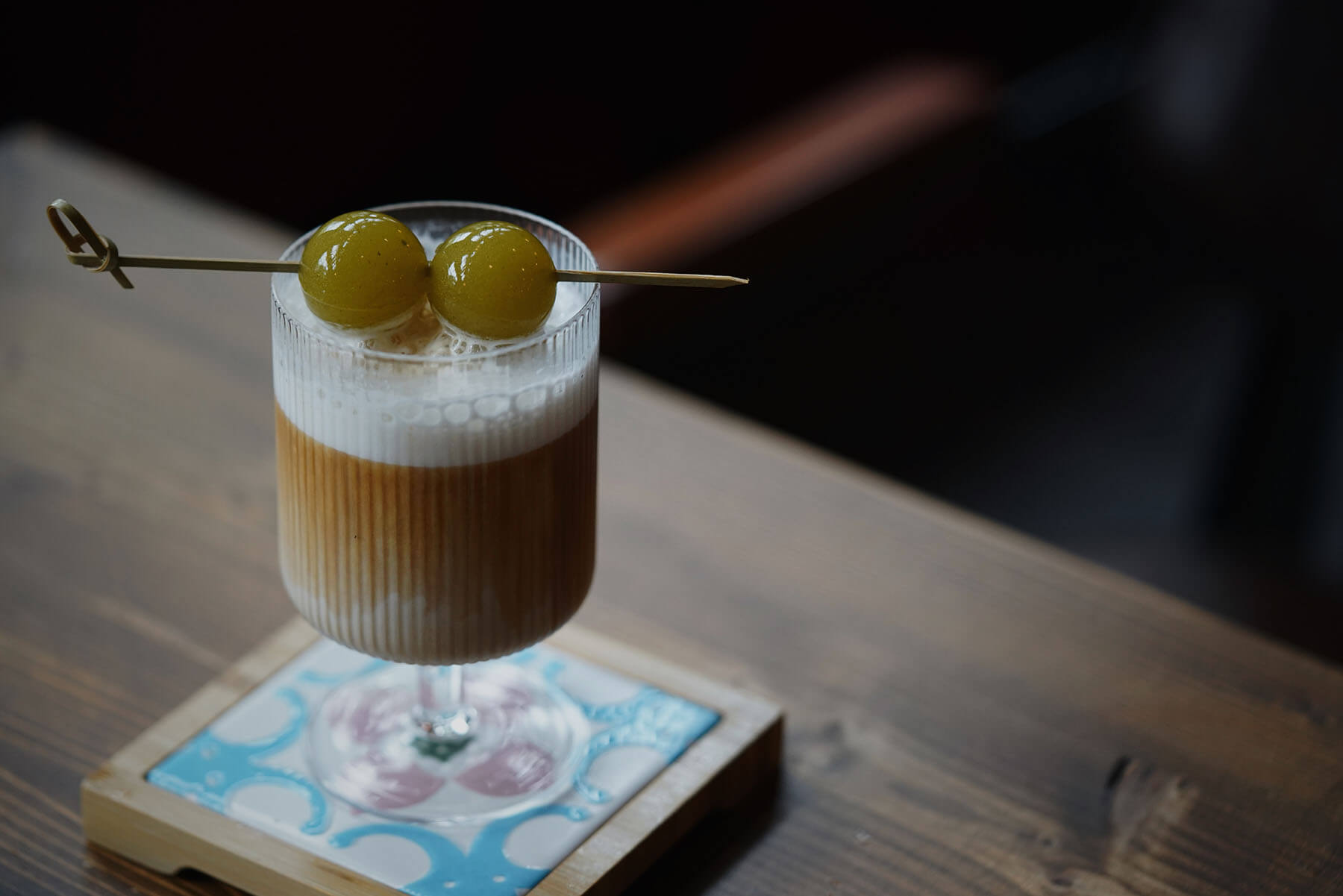 「國王蝴蝶咖啡」以義式咖啡為基底,將傳統白醋與精品咖啡濃縮均質處理,混合奶泡與白芝麻油霧,並佐以小黃瓜汁熬煮而成的晶瑩球凍,製成一杯貫徹嘉義「白醋涼麵」精神的「嘉義特調-白玉」,為傳統飲食帶來嶄新詮釋。