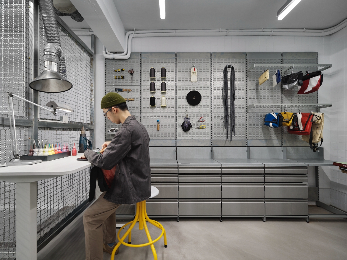 FREITAG by FUJIN TREE GROUP 自 2018 年開始提供維修服務,包包醫生 (BAG DOCTOR) 終於有專屬的維修空間,同店內強烈「工廠」設計風格,穿透的鐵柵欄隔間設計,讓消費者能直接觀賞修復包袋的過程,讓品牌與包袋能再陪伴下一個十年。