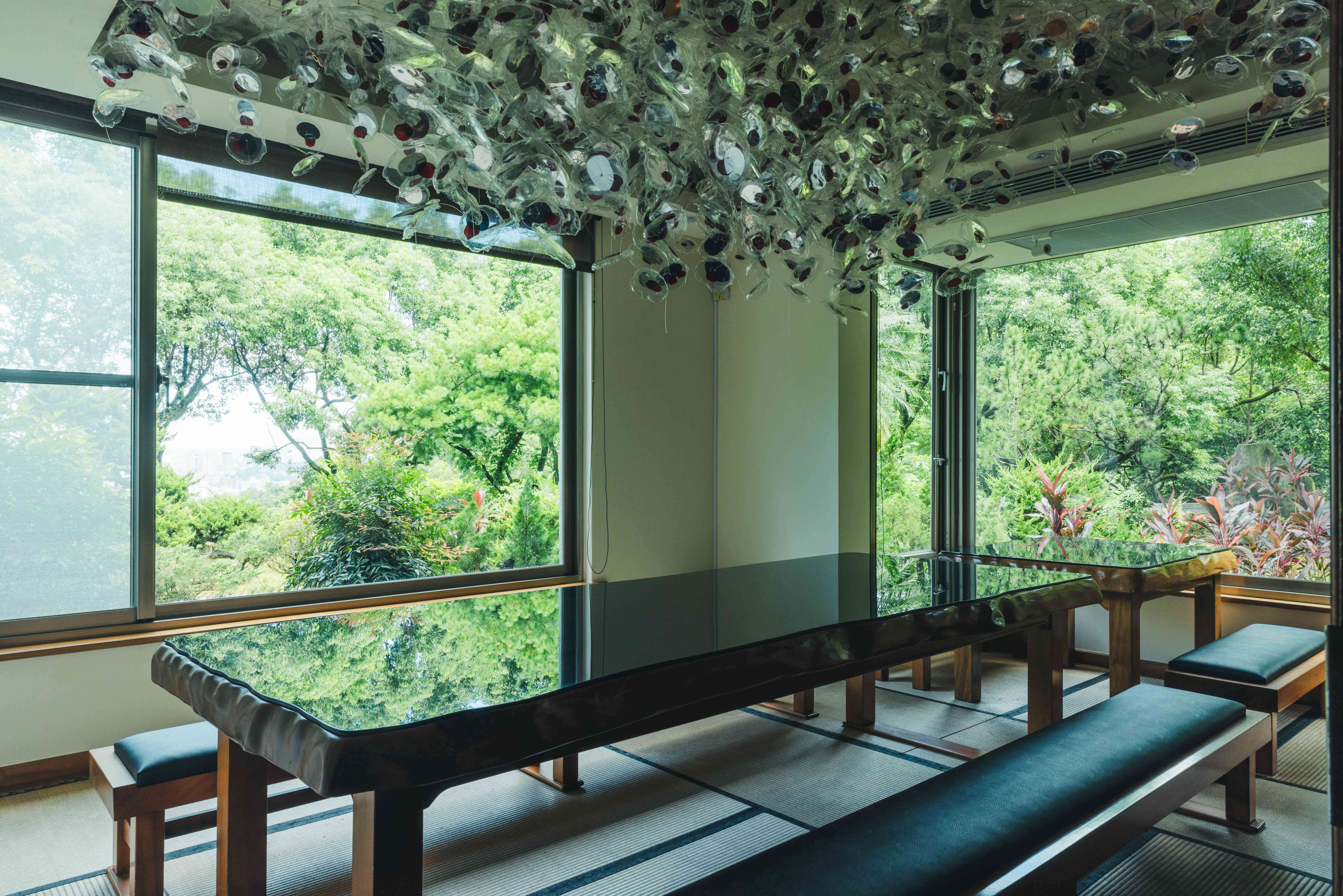 走入梧桐墅,迎接旅人的「白鳥」裝置意象是由操刀「馥森阪治Trio」的建築師黃慶洲打造,抬頭望見漫天「鳳凰⽻麟」飛舞,是花藝師朱永安的巧思,他運用軟雕塑(Soft Sculpture)將近三萬片艷紅的薔薇永生花呈現鳳凰嫣紅羽毛,傳遞佳賓吉祥、繁榮和幸福寓意。當風流動,羽麟隨著風響協奏,合鳴迎賓的空靈鼓,將靜謐⽇式庭園的晝夜與四季風光引入室內。