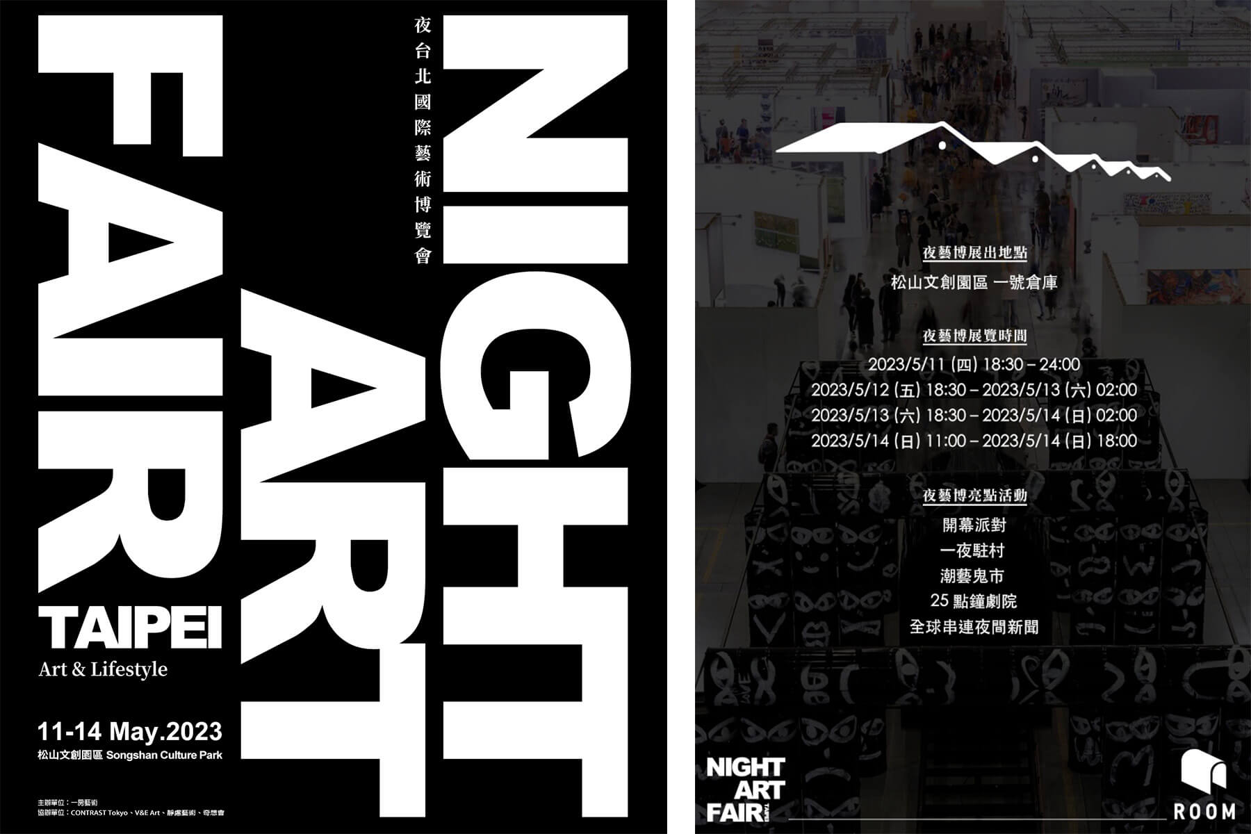 NIGHT ART FAIR TAIPEI 夜台北國際藝術博覽會 2023 年 5 月 11 日晚間正式開幕,開幕活動將由夜藝博策展團隊導覽展出並舉行開幕派對。翌日的夜藝博「一夜駐村」計畫,邀請台灣聲光藝術先驅姚仲涵與其知名作品光電獸共同展演,並與日本燈光裝置藝術家 Hiroyuki Arikawa 進行台日藝術交流對談,帶來一夜靈光乍現。