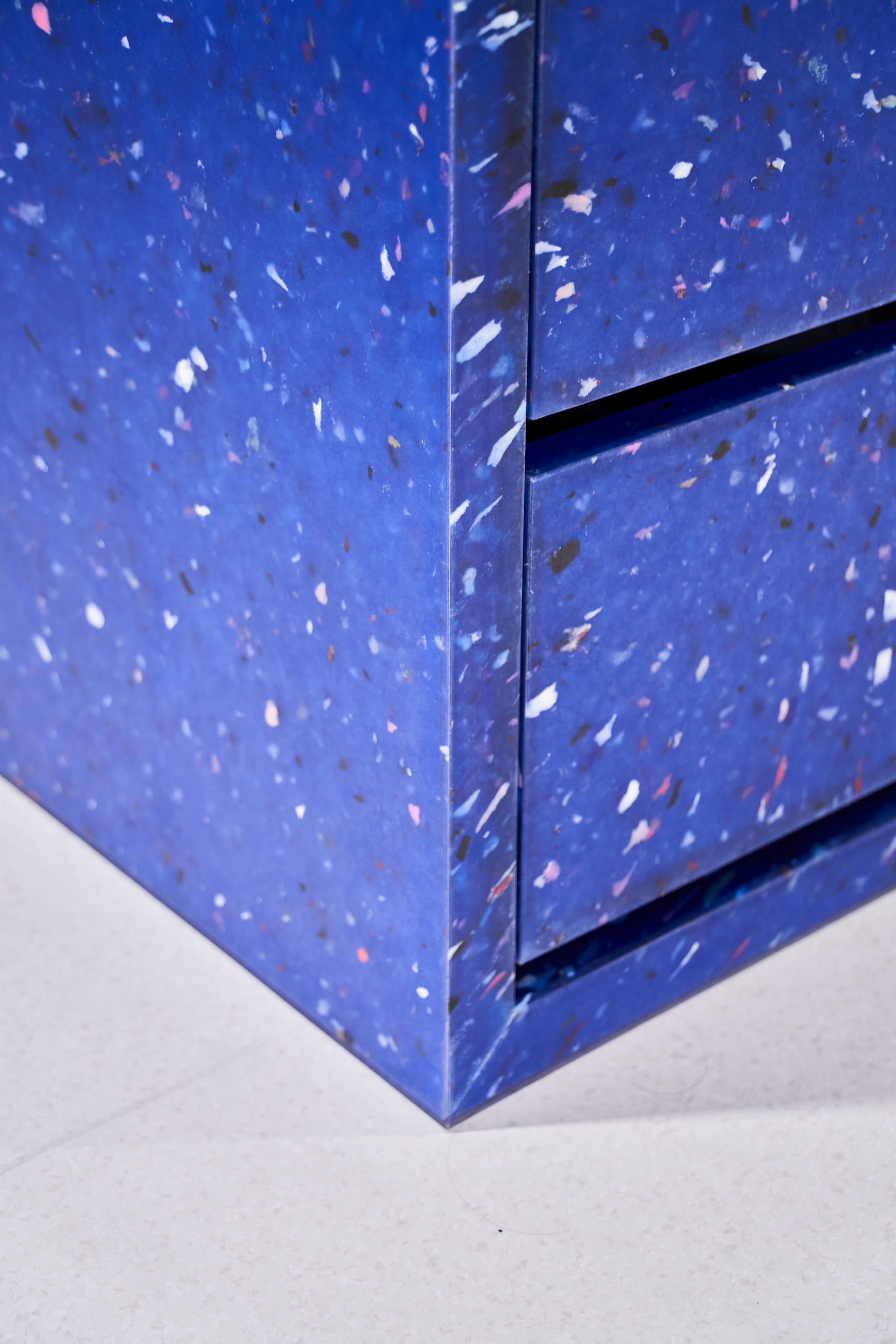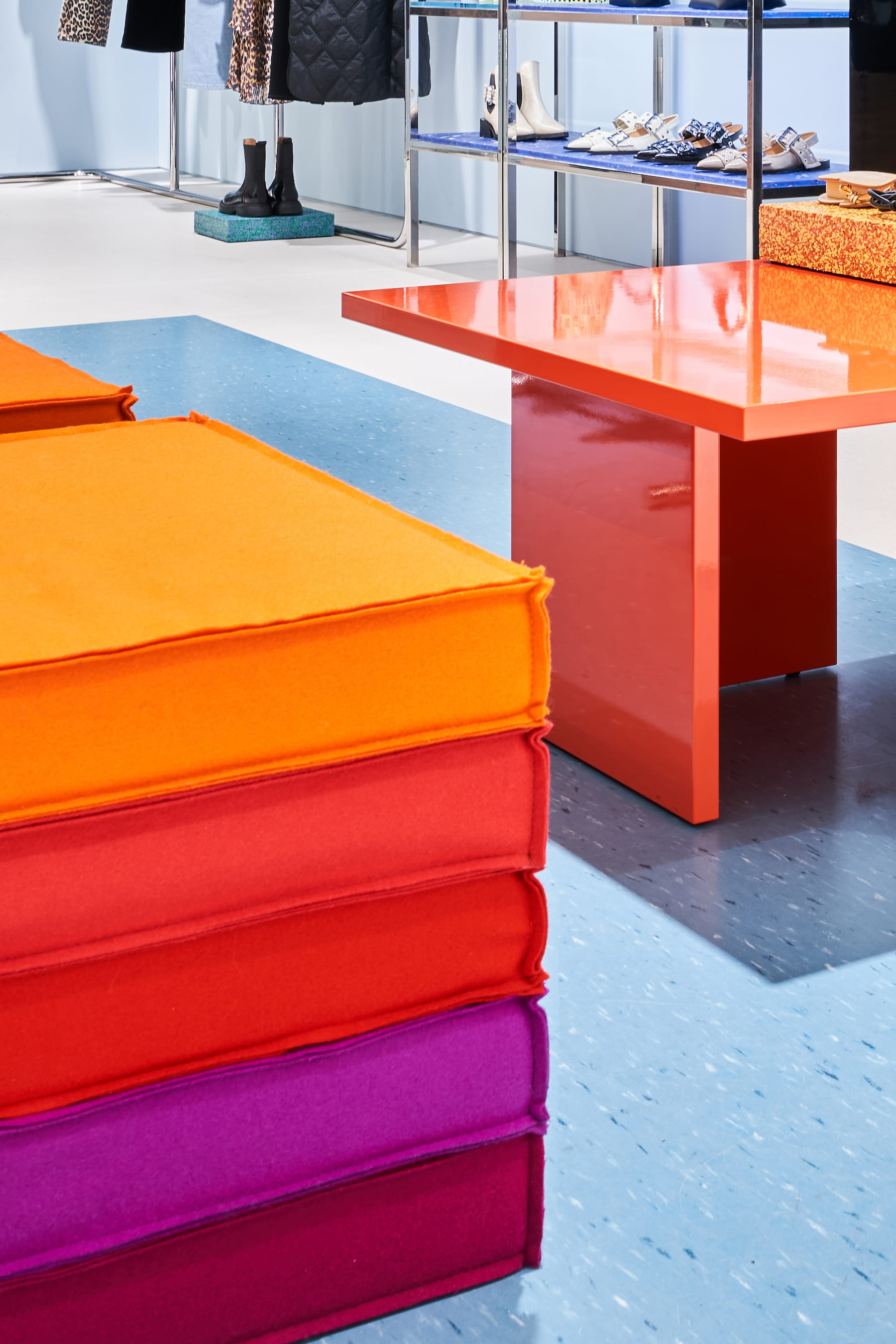 丹麥人對於天然資源相當重視,使用最環保、天然的材料,讓家具貼近生活,即使極簡也不失功能性。實踐永續環保的精神也延續到 GANNI 的店內設計,踏上環保認證的橡膠地板一起步入店內,目光即刻被由Smile Plastics公司利用回收塑料製成的藍色展示台吸引,深入店內角落,則有兩座回收布料再生的彩色堆疊沙發,造型大膽的#SCRAPLIFEPROJECT展示台則將品牌DNA展露無疑,創造GANNI個性化的購物體驗。