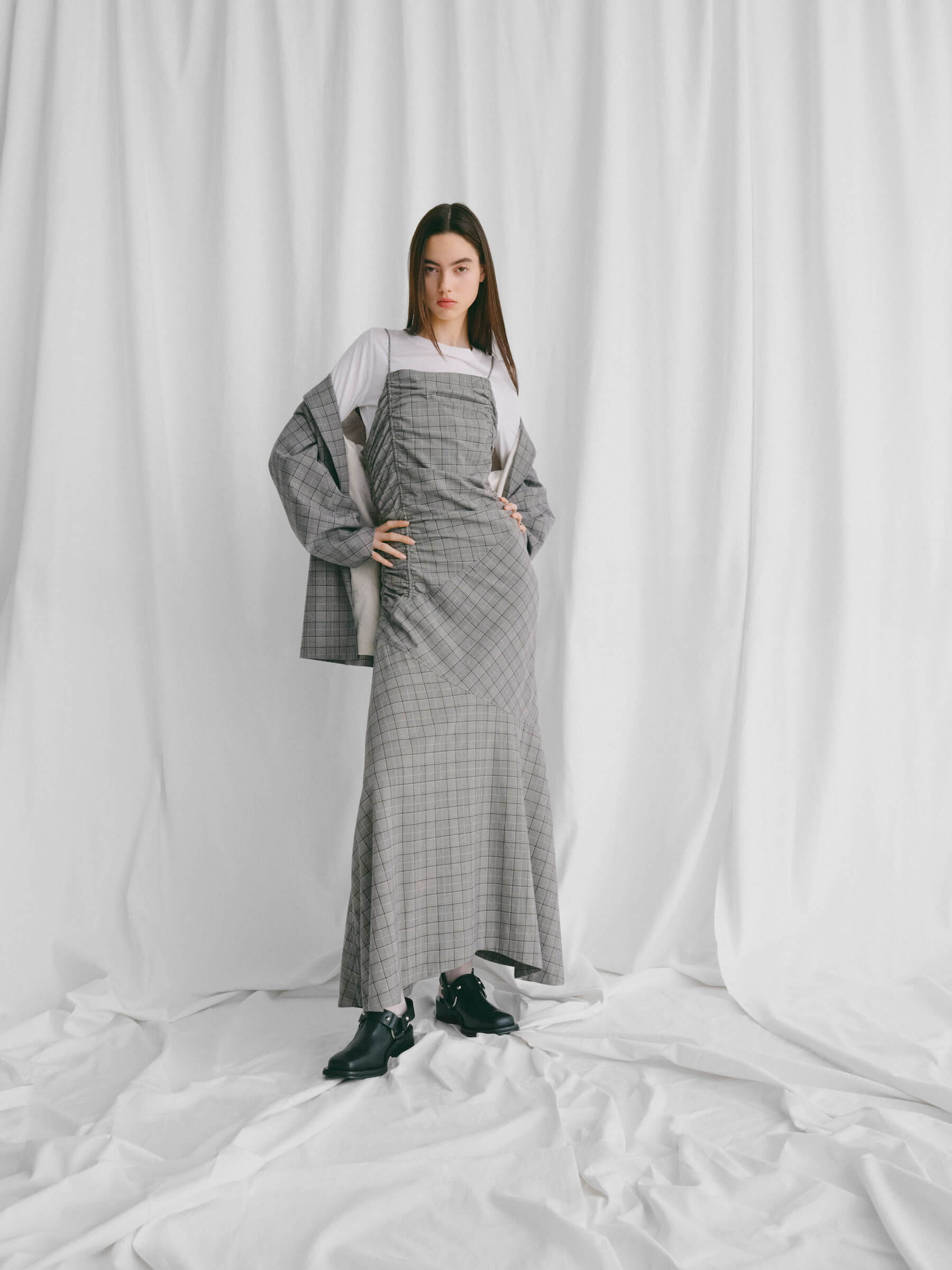 壓紋綁帶西裝外套-牡蠣灰 NT$11,800、壓紋中腰西裝褲-牡蠣灰 NT$8,800(左圖);格紋抓皺吊帶長洋裝-霜灰色 NT$13,800(右圖)