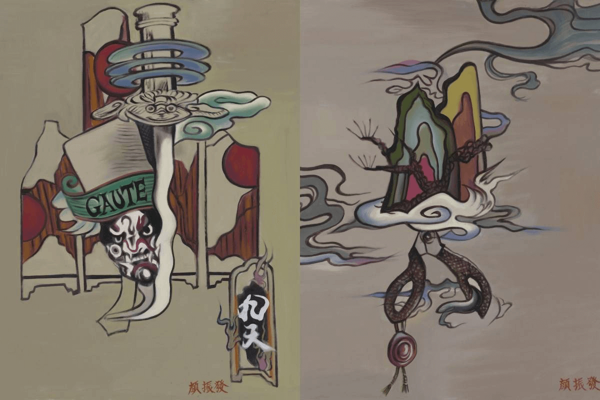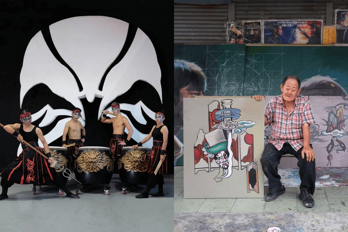 GAUTE根據與「九天民俗技藝團」的合作,製作出四幅原創的官將首圖騰,再透過電影海報繪師顏振發(右)之手呈現。