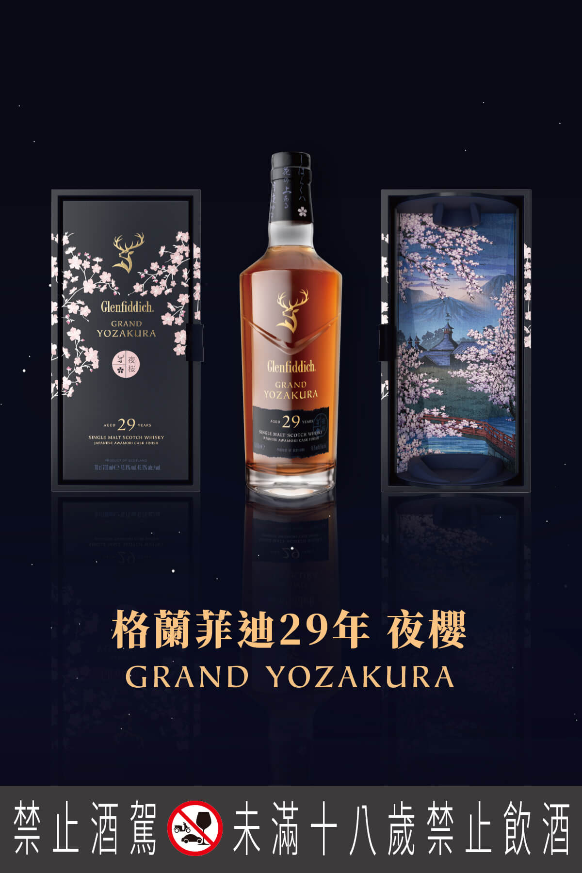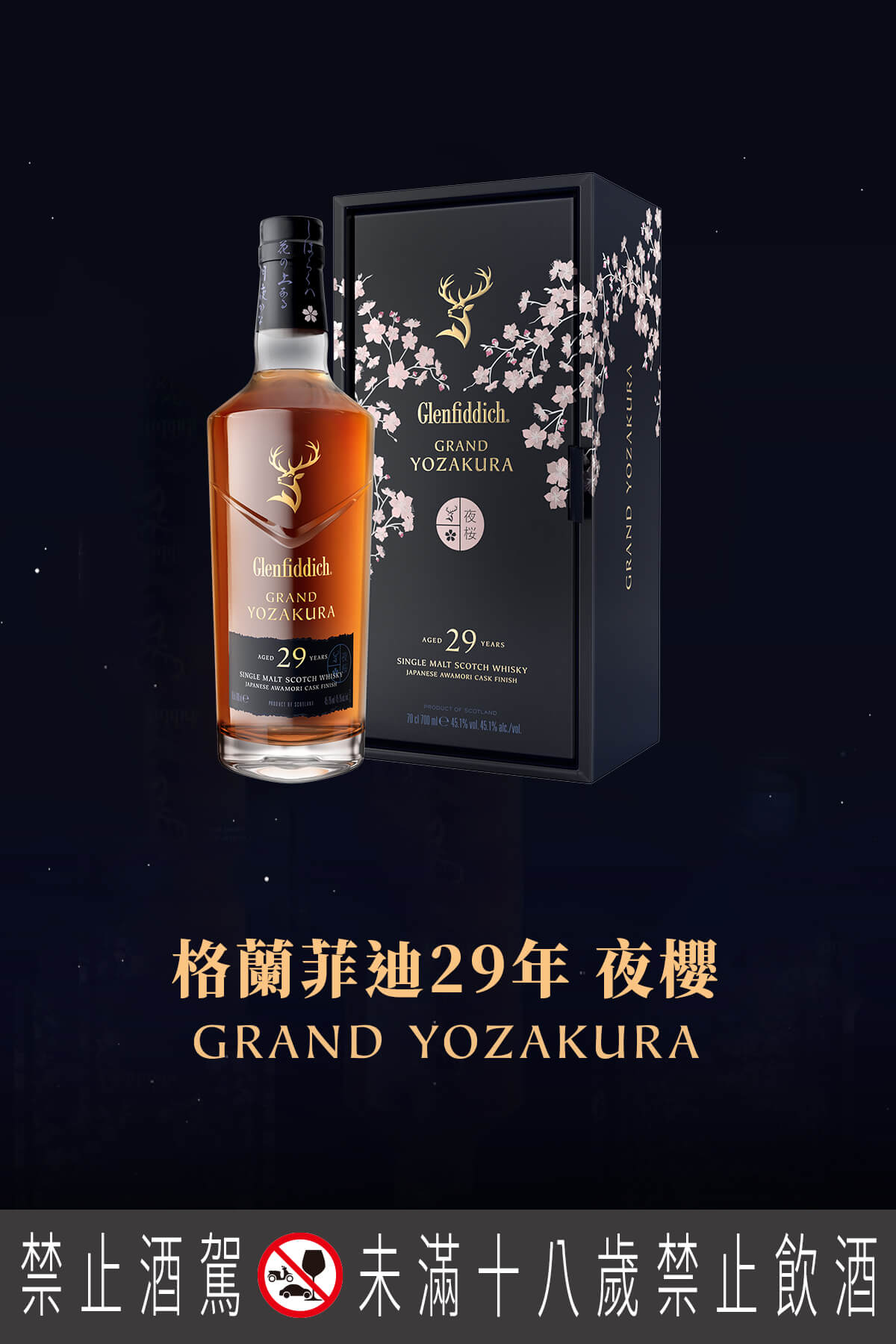 自古至今,櫻花的意象總是成就出偉大的作品,格蘭菲迪也將旗下奢華系列最高年份的酩貴之作取其繆思,命名為「格蘭菲迪29年夜櫻 (Grand Yozakura) 單一麥芽威士忌」。過往蘇格蘭威士忌從未在日本泡盛酒桶 (Awamori Casks) 進行熟成,史無前例的製法淬煉出珍貴酒液,使風味在蘇格蘭威士忌之上增添日式風情,數量稀少,宛如美麗卻花期短暫的夜櫻。