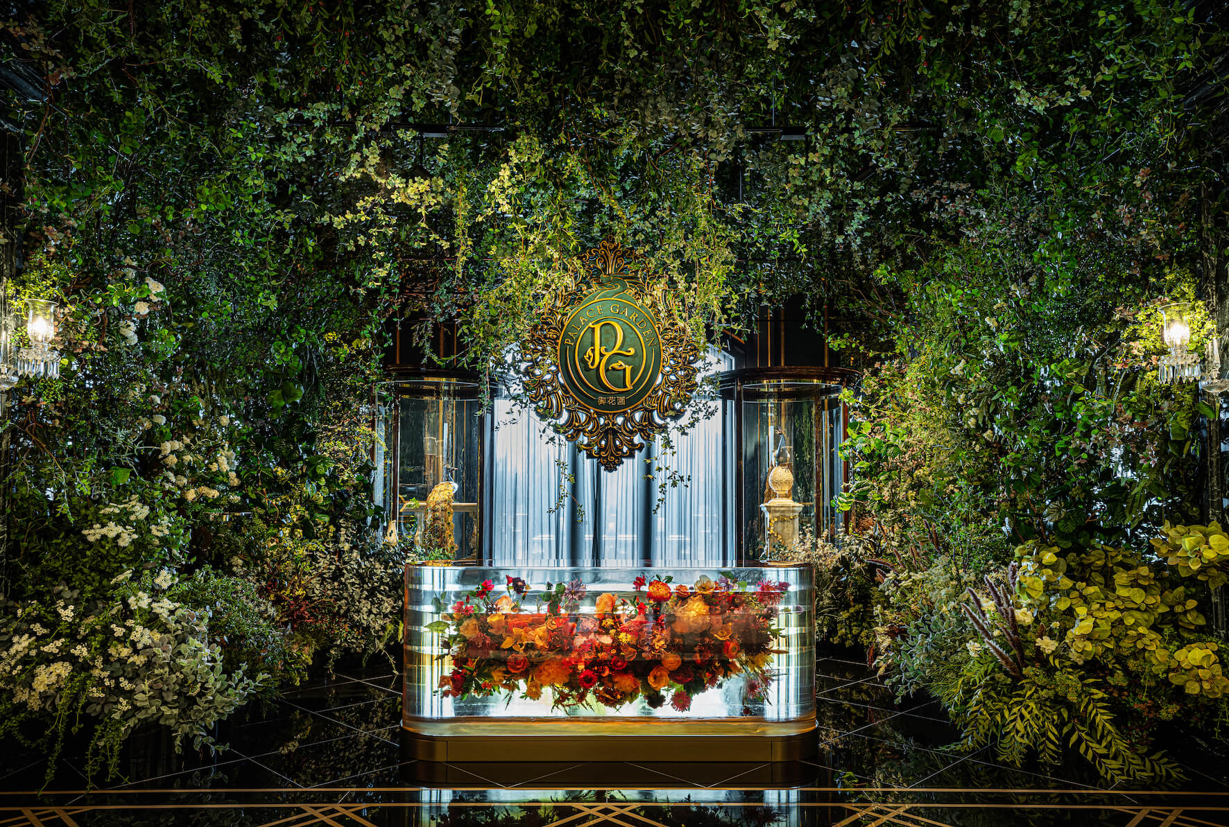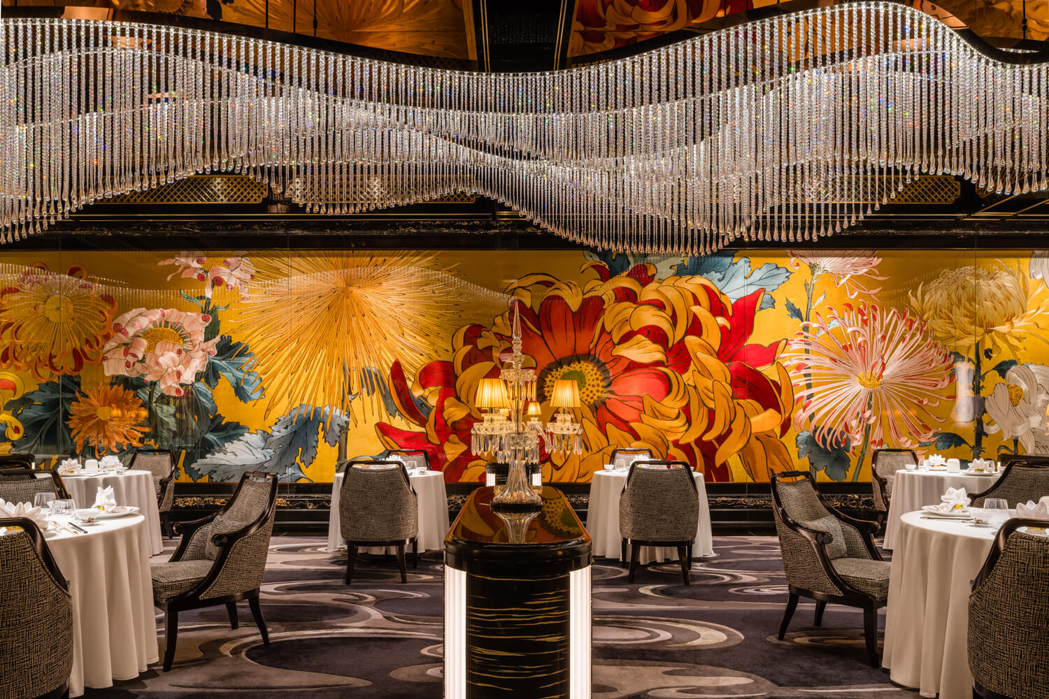 最具代表性的「御花園」由之名設計師陳幼堅打造,結合中西宮廷園林概念與蘇繡藝術裝飾,呈現華麗細膩的用餐空間。主用餐區牆身以一幅35米長、2.5米高的訂製絲綢刺繡作品貫穿整個大廳,採用聞名中外的蘇繡工藝,細緻呈現絢爛多姿的菊花圖案,其靈感源自日本藝術家長谷川契華百年前的木刻版畫古籍《契花百菊》。