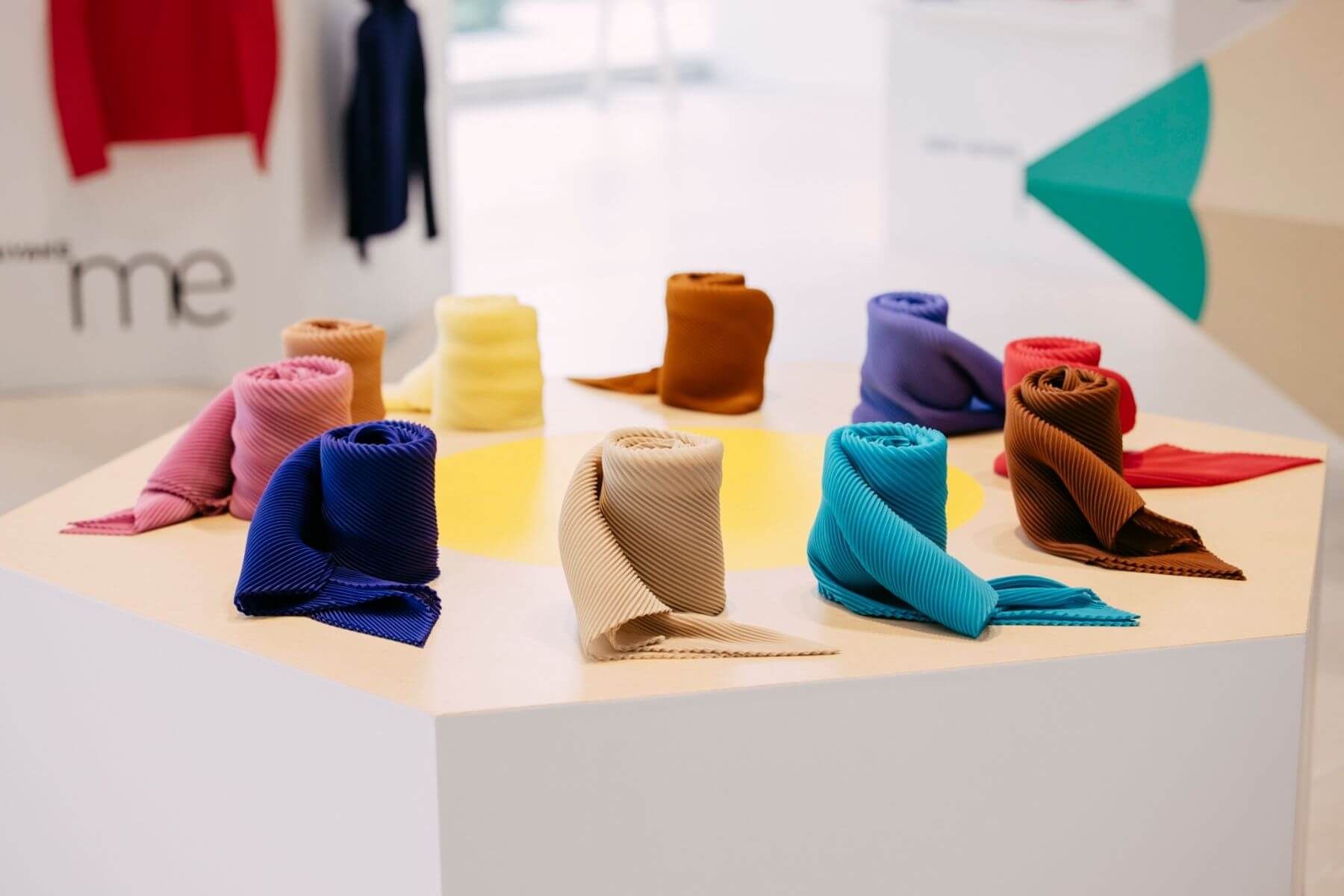 品牌創始之初即以四倍大的布料雙向熱壓製成密褶,為me ISSEY MIYAKE最經典原創的設計,透過每季的概念、印花、色彩,直接呼應當季設計靈感。本次me ISSEY MIYAKE快閃店的限定商品為十色調色盤密褶、十色圍巾、12色褶包與12色昆布包。