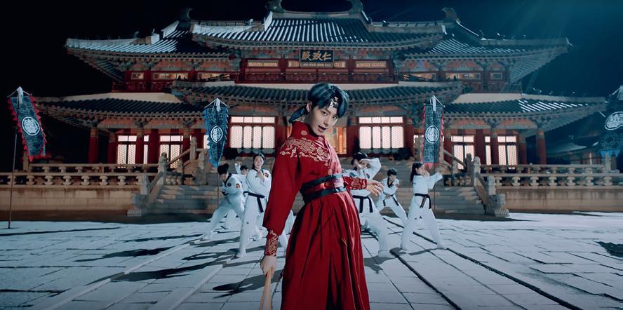 ONEUS 的〈Lit〉音樂錄影帶(「跆拳道版」,2021 年)劇照,展示了韓國傳統建築、服飾、樂器、舞蹈以及武術,正是韓國流行音樂向世界分享韓國文化的例子。