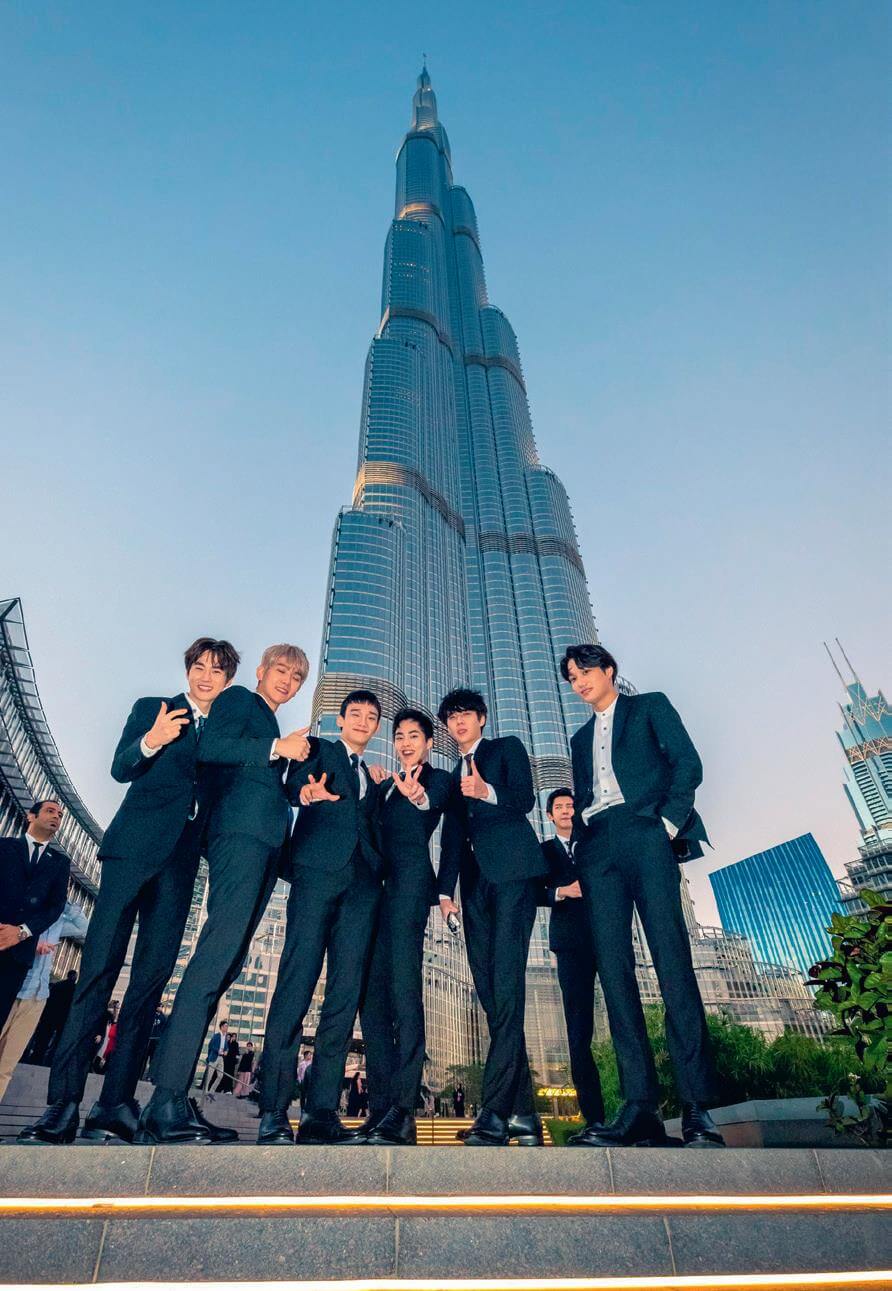 2018 年,韓國流行音樂團體 EXO 在杜拜的哈里發塔(Burj Khalifa)前合影。EXO 在阿拉伯聯合大公國的高人氣為他們摘下杜拜「星光大道」上的一顆星。