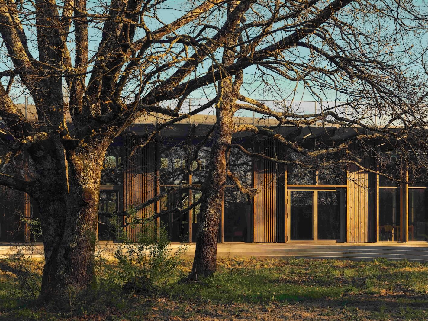 Loupes工坊由位於Bayonne的建築事務所Patrick Arotcharen Architecte操刀設計,該事務所亦曾打造Saint-Vincent-de-Paul據點。坐落於林木環繞的自然環境中,建築彷彿自周圍植被中緩緩浮現,修長造型順應地形輪廓,呼應林間的自然線條,使整體建築與環境融為一體。遮陽棚與通透的門面設計勾勒出和諧的律動感,專為森林環境排導雨水而設計的雙曲線屋頂,成為定調建築風格的重要元素;建築前方一處露台向外延伸,銜接半圓形階梯,中央矗立兩株挺拔的橡樹。工坊沿著南北向佈局,使自然光得以深入工坊核心,穿越可供交流與用餐的大型接待空間後,一條蜿蜒的內部街道串聯八座生產工坊,大面積玻璃立面將樹冠美景盡收眼底,營造出四季皆如置身森林的工作體驗。