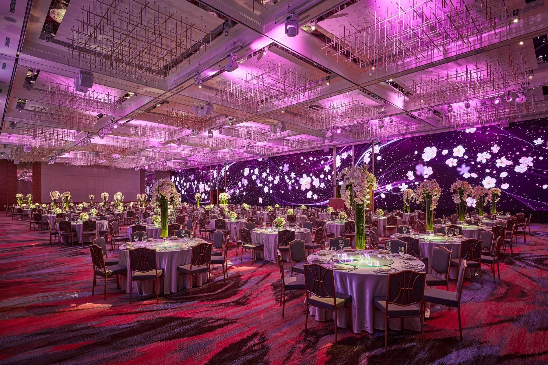 台北漢來大飯店的國際宴會廳以頂級奢華的設施聞名,擁有全台最長(56.3米)和最高(5.9米)的演唱會級環場大螢幕,以及高質感令人矚目的管柱狀水晶吊燈,營造出奢華高雅的氛圍。國際宴會廳的獨特之處也體現在其7.5米挑高的無樑柱空間,可以同時容納1200人,展現了極致的宴會氛圍。漢來美食表示,現今新人對於婚宴場地和菜色的期望日益提高,在這樣的潮流之下,全新登場的台北漢來宴會廳,將讓準備舉辦婚宴的新人忍不住發出驚嘆聲。