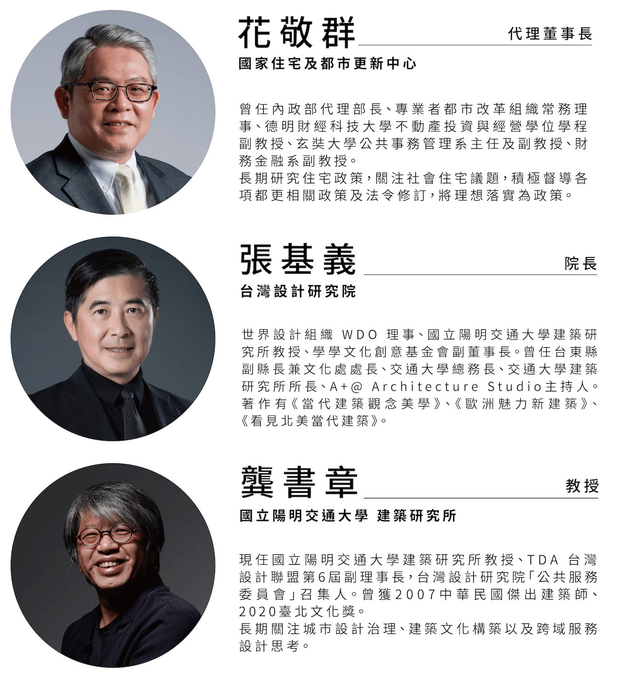 本次的新書發表特別邀請長期研究住宅政策,關注各式都更與社會住宅發展議題的國家住宅及都市更新中心-花敬群代理董事長、致力推動城市美學,以國家設計政策引領產業創新的台灣設計研究院-張基義院長,以及城市設計、建築文化與跨域服務設計思考的工作者國立陽明交通大學建築研究所-龔書章教授,與我們對談分享專業者對於城市發展、都市更新、海馬迴的心得與見解。