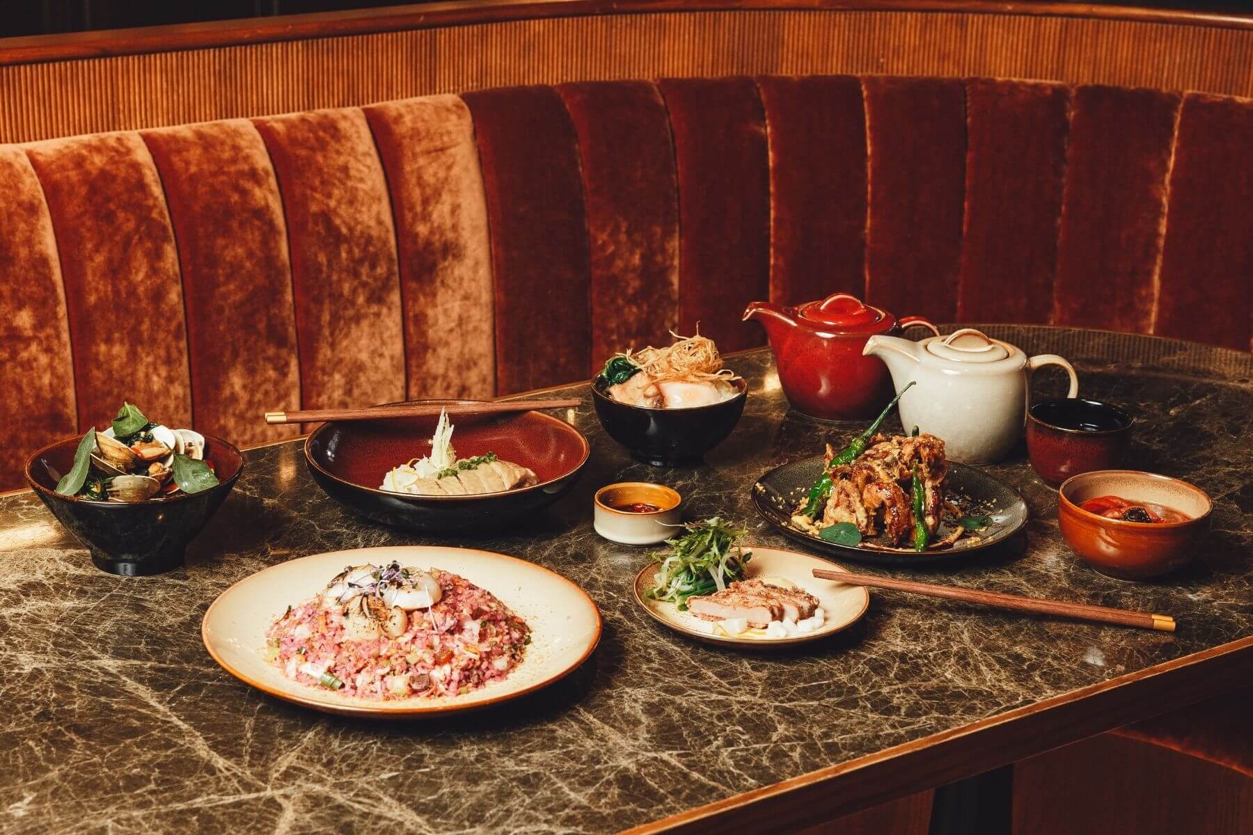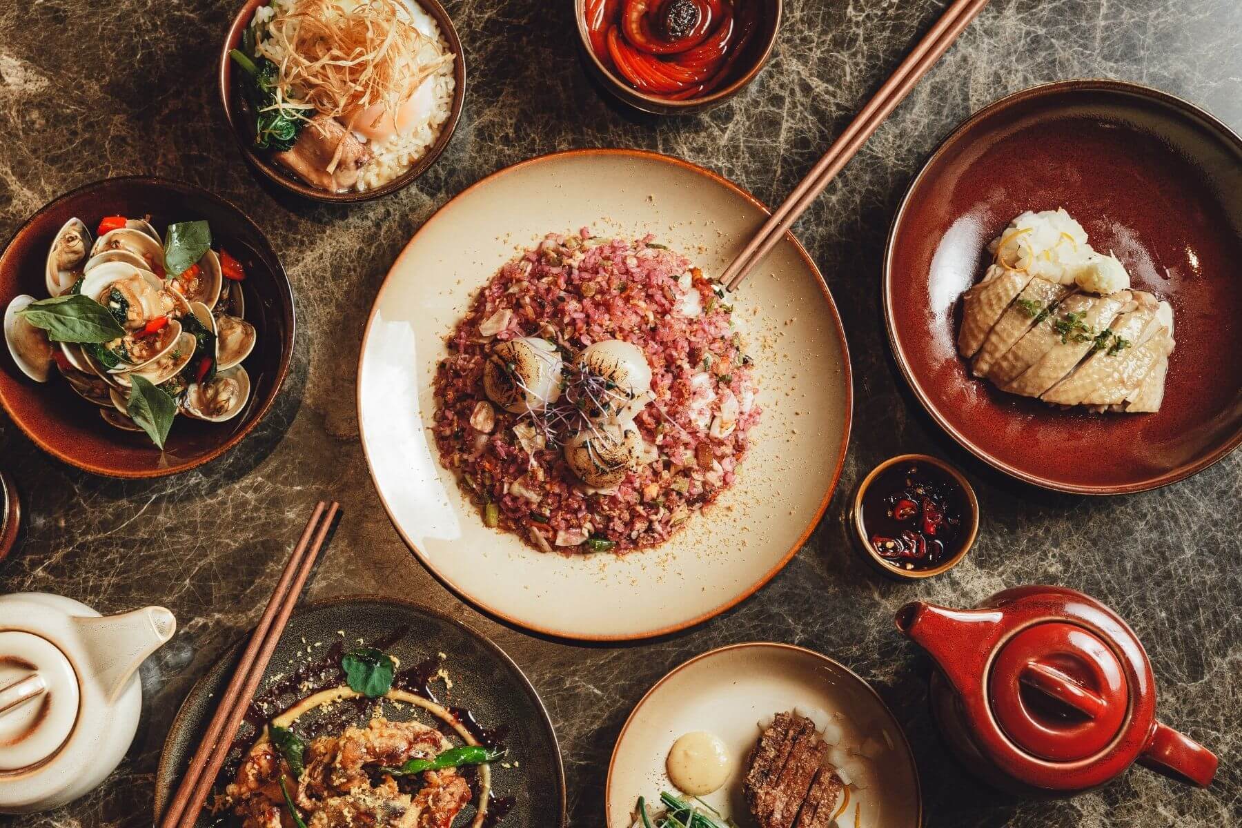 接著主菜上桌,同樣讓人目不轉睛。像是伴著洛神花醬汁的金沙軟殼蟹,有著完美的鹹與酸甜感平衡;吃下塔香炒蛤蜊,每一口都是道地風味;身為重頭戲的主食,就由炙烤干貝烏魚子炒飯與麻油雞湯飯擔綱。滿桌料理搭配HOLA每個具備獨一無二紋路的晴陽窯燒餐具,以及有著喜氣設計的五福臨門紅檀木筷,迷人的視覺與風味為感官帶來層層驚喜。