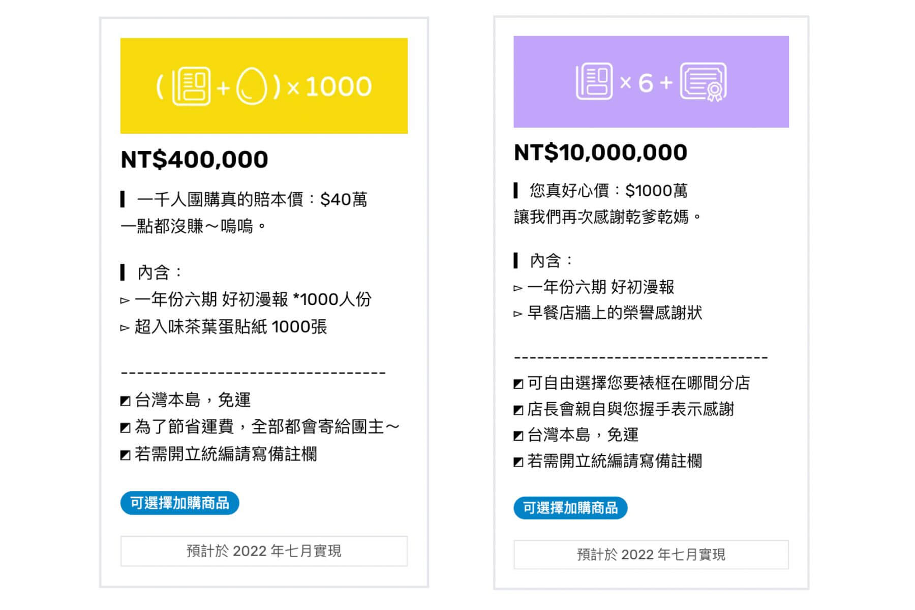 壞貓2號為《好初漫報》的募資方案推出了40萬「團購價」與1000萬的「乾爹乾媽價」。(圖片/翻攝自嘖嘖募資網站)