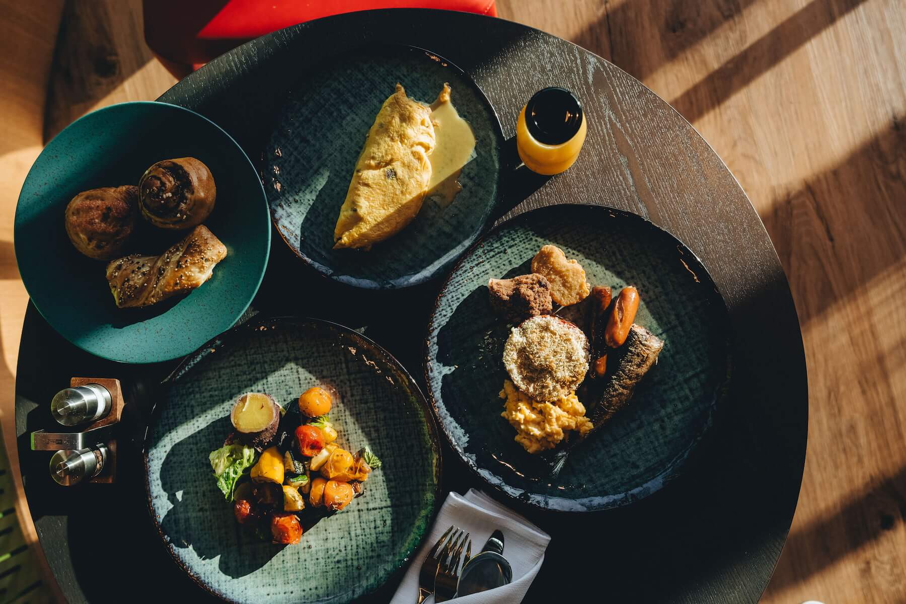 例如團隊以鄒族元素、台灣藍鵲為設計概念,從客房床頭的楓葉飾板、獵人風迷你吧櫃子,都以藍鵲的紅、藍兩色為主軸。酒店內的餐館「ton’u粟餐廳」也以鄒族主食「小米」為名,aveoveoyu高空露天酒吧,在鄒族語中也意指「我心充滿喜悅」,諸多細節都在突顯在地文化。