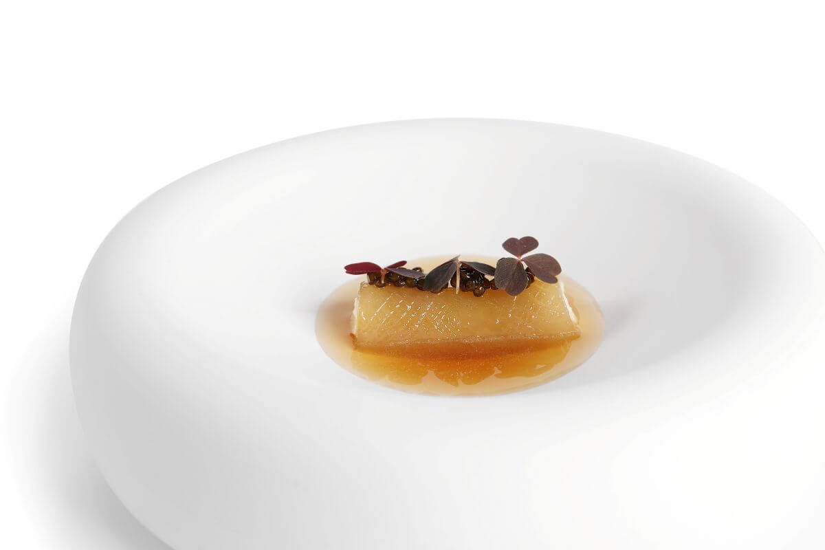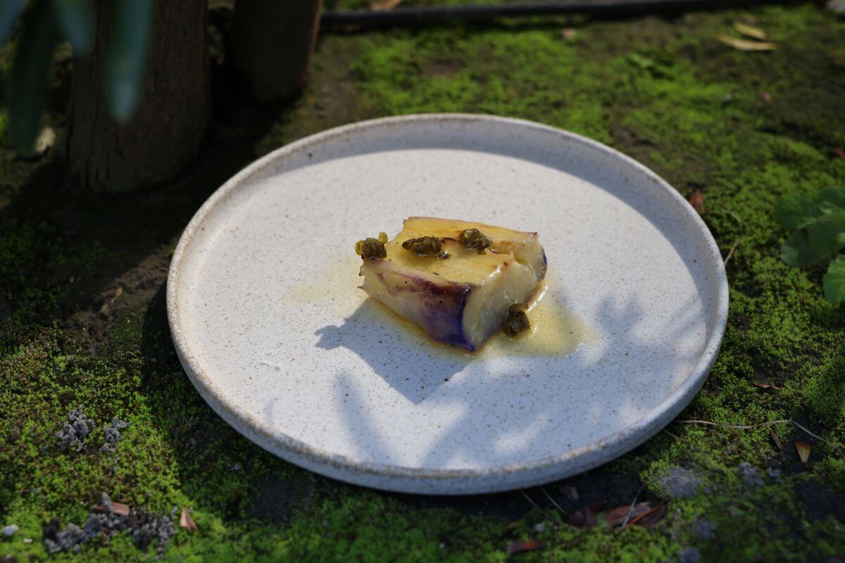 料理發想來自西班牙總店附近山區常被晨霧壟罩的自然景觀,茄子的深沉色澤猶如堅實岩石,搭配上如晨霧般輕盈的檸檬奶油醬一起享用,創造出視覺與味覺的雙重對比。爽口清香的風味特質完美呈現夏季的清新感,讓人彷彿置身於西班牙北部「綠色西班牙」的山嵐之中,感受那份涼爽與寧靜。