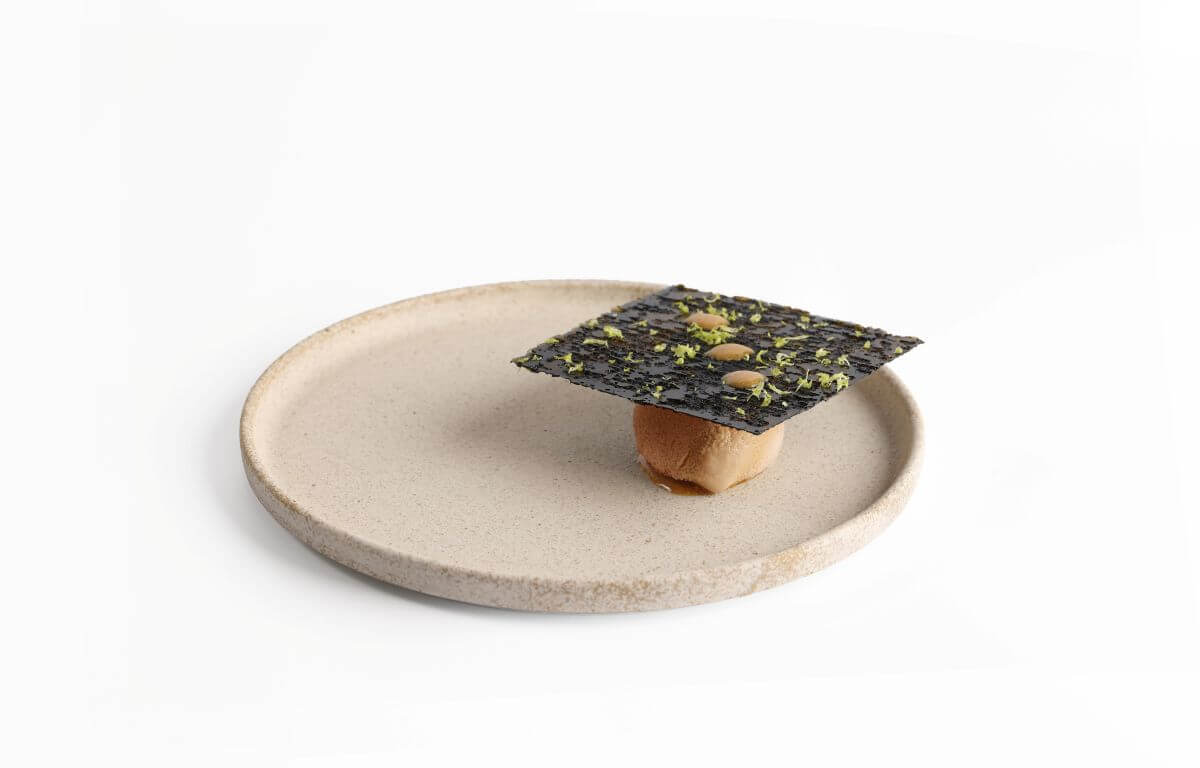 在這道充滿詩意的甜點中,香脆海苔精心塑造出如落葉般的光影效果,還沒開動,便帶來視覺上的藝術享受。食用時搭配著下方黑蒜味噌口味的冰淇淋並沾取榛果醬,層次豐富而不膩。海苔上巧妙撒上的米麴粉與檸檬風味讓整體口味畫龍點睛!