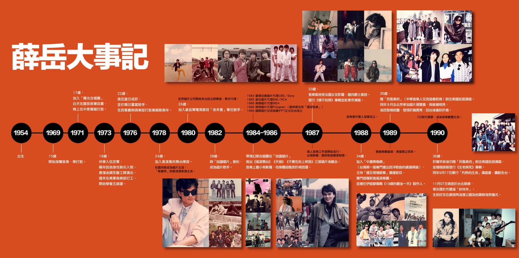 薛岳在歌壇的存在其實很短,從1984年第一張專輯「搖滾舞台」到1990年11月17日過世,只有七年左右,一共只出了「搖滾舞台」、「天梯」、「不要在街上吻我」、「情不自禁」和「生老病死」五張專輯。