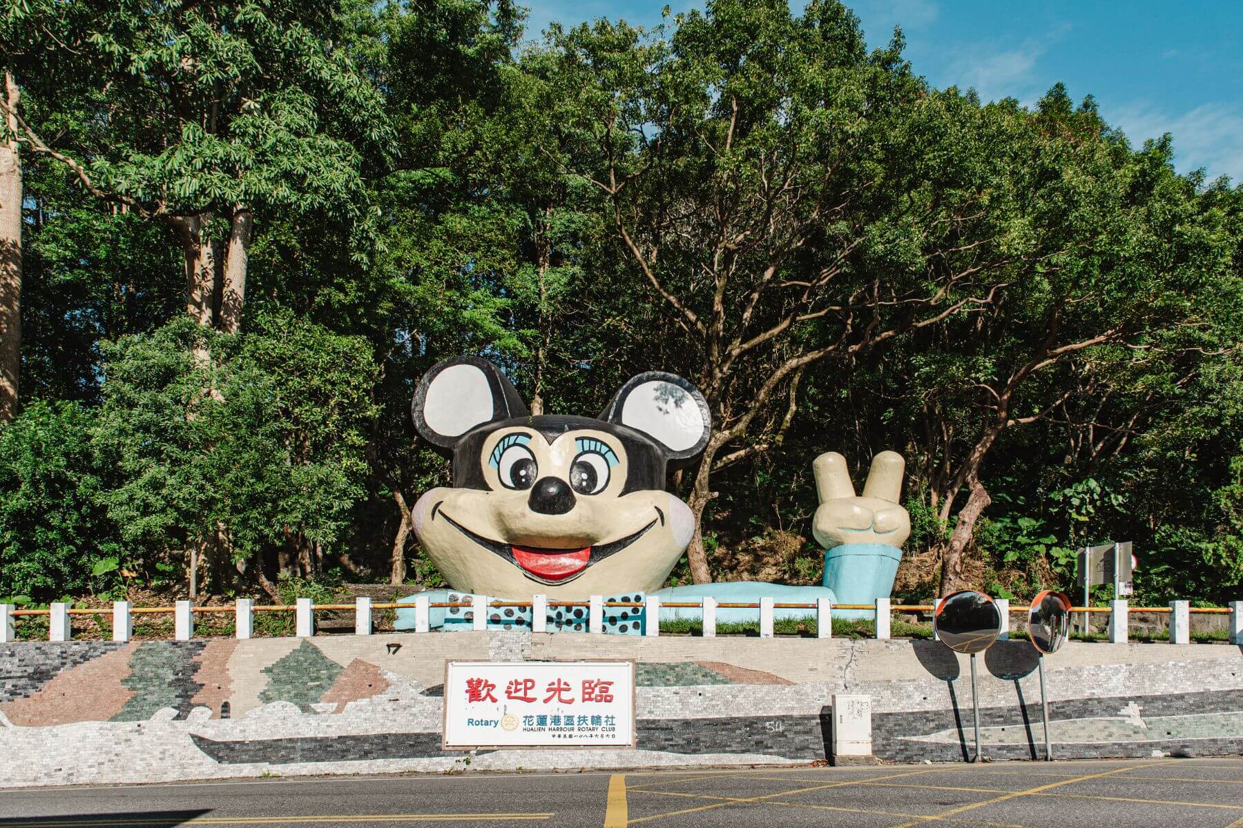 ❶ 美崙山公園米老鼠:隻比著「YA」的老鼠原型,據阿榮師說,最早其實是「太空飛鼠」,當年流行的卡通角色。其後米老鼠風潮襲捲,才易容換妝為大家喜歡的模樣。近期臉書上發起了「跟花蓮米老鼠玩剪刀石頭布」的迷因式社群活動,顯示有四千多人參與,足以證明這是一座惹人注目的地標。