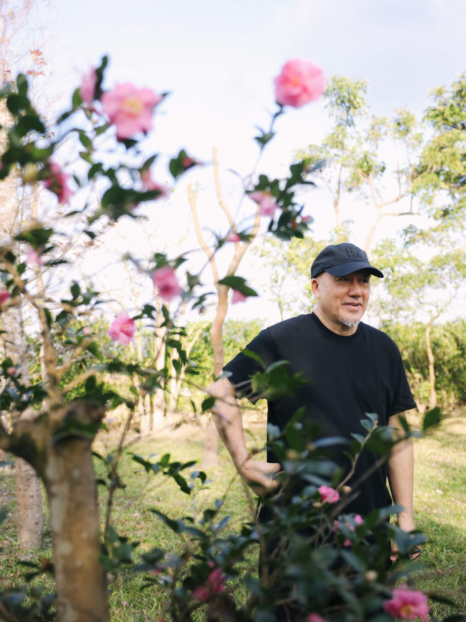 葉子奇的工作室被群山環抱,他習慣從下午一路畫到清晨,累了就去看看悉心照料的花與樹。庭園裡有烏桕、台灣欒樹、大葉山欖等樹種,也蒐集了芙蓉香波、菊冬至等茶花品種,葉子奇說茶花戀土,在古典文學中常被比喻為恬淡隱居的君子,似乎也映照出他現在的心境。