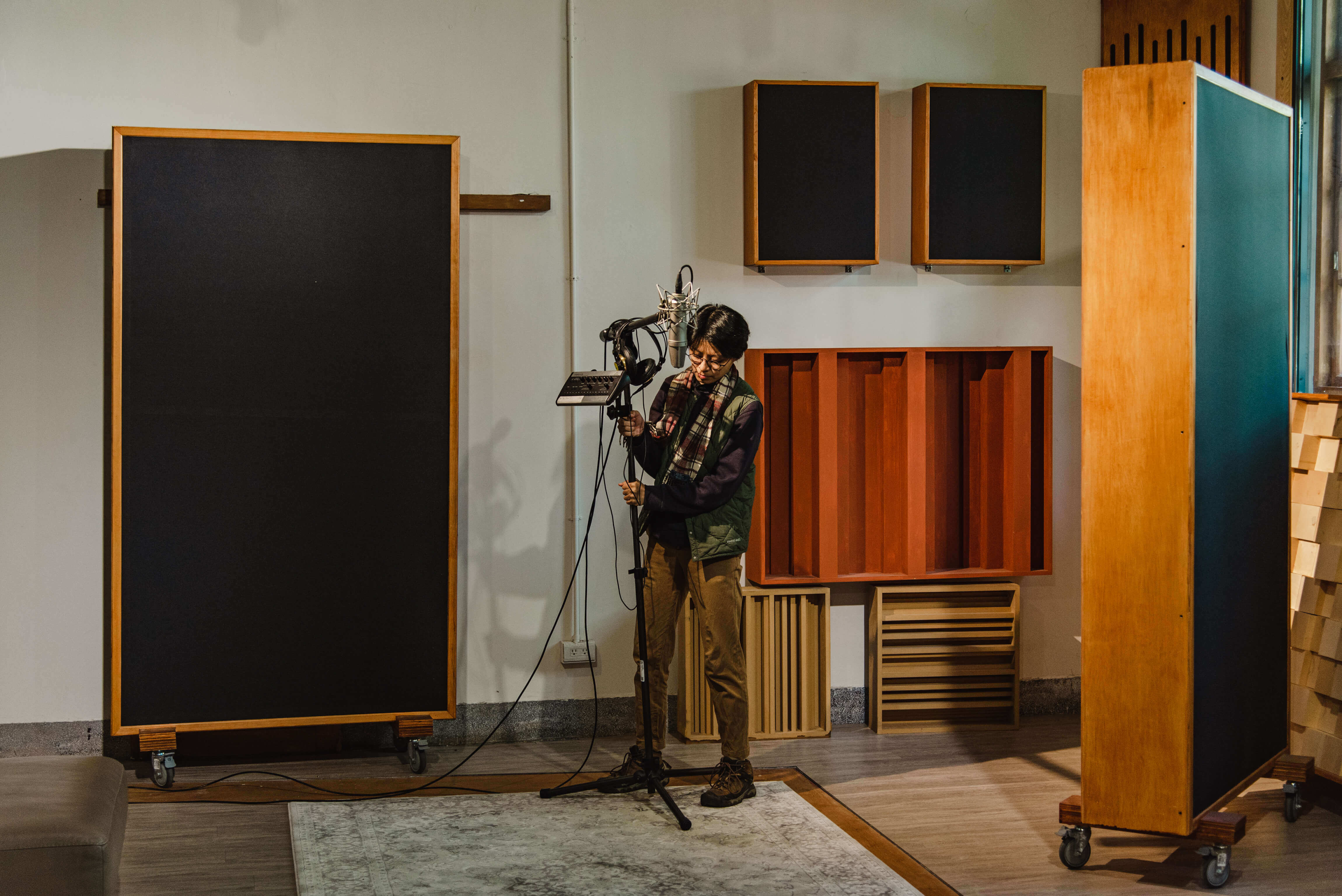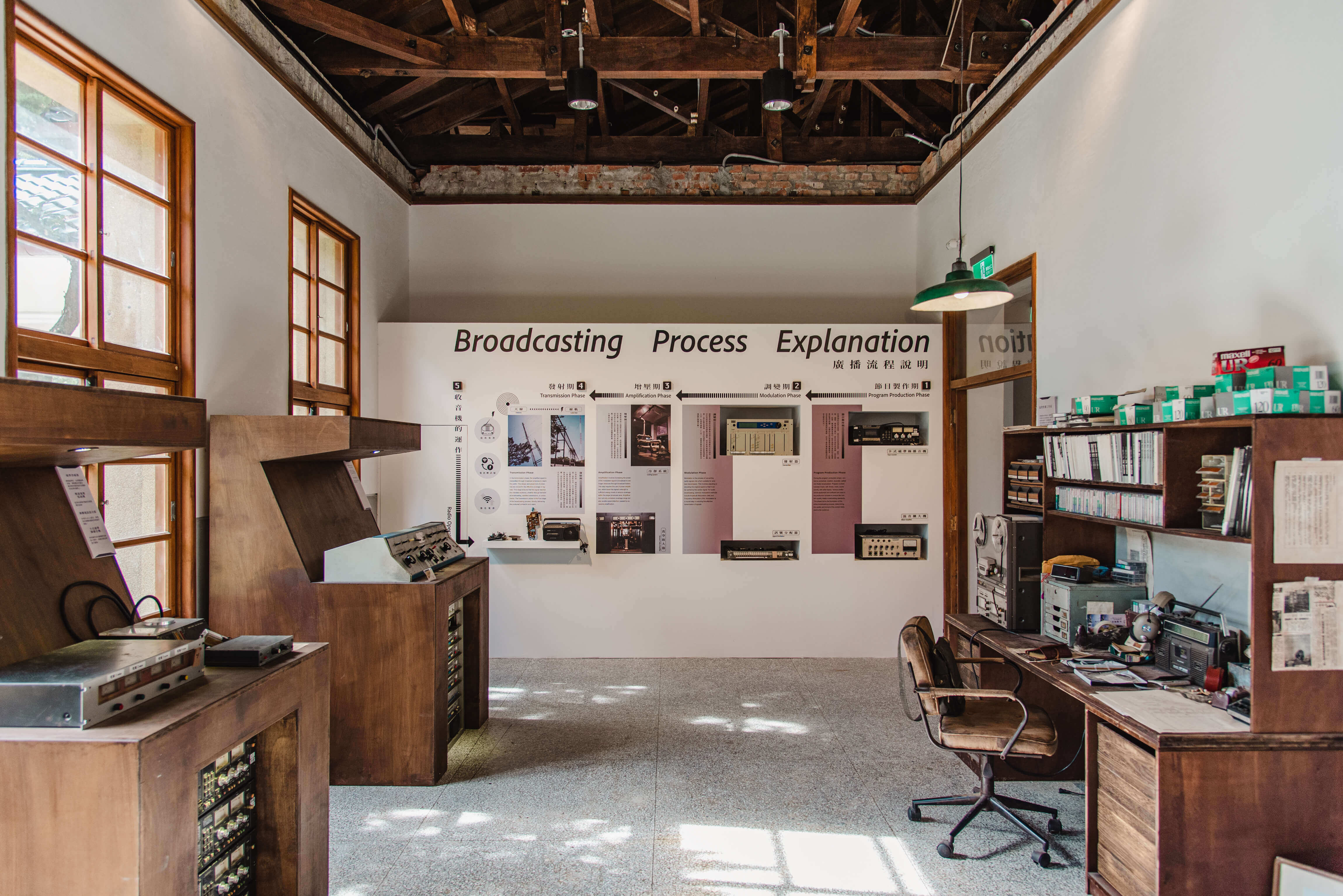 如今推開木門,走進這棟檜木挑高結構的日式建築,室內保留建築原初多隔間的樣貌,有一半的空間以展覽陳列為主,第一道進入視線的,是花蓮地形模型與聲景,旅人能以俯瞰的視角,望著白雲、綠地、湛藍海水組成的花蓮地貌,戴上耳機聆聽地方生活;往下一個房間探去,留聲機、磁帶機、黑膠唱盤等不同時代的聲音播放器陳列;另一側上有專業復古的的錄音空間供旅人預約體驗,而從中廣時代保留下來的工作桌上,老舊皮革筆記本散落,塞滿煙蒂的煙灰缸,古老斑駁的皮椅承載著專業廣播人的千頭萬緒。