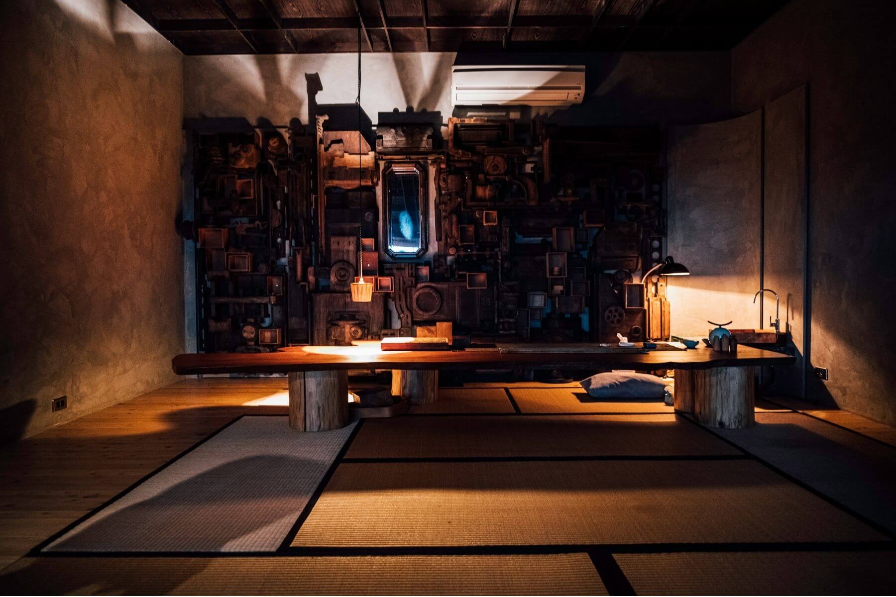 彎腰走入刻意壓低高度的門,不大的榻榻米室只有一堵牆、一盞燈、一張桌,牆堵在低光源下隱現月之陰暗面,遠看如同山巖,近看是舊時代工業機骸的拼湊。吳透生在府城台南,自小和大人同過老派生活,茶是離不開的慣習。