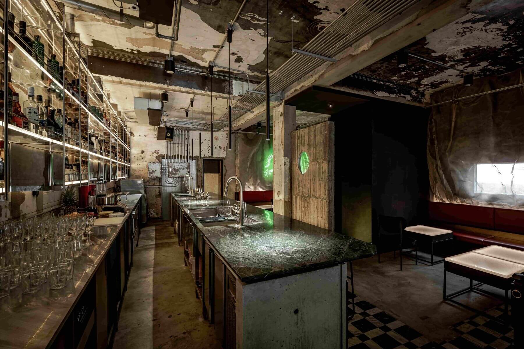 以「退一步的質感」為發想,使用燒杉打造黑色外觀,並刻意屏蔽內部空間,只留下高度125公分的一幅橫窗,使外人只見杯觥交錯,卻不知酒從何而來,必須屈身窺視才能看見黑暗中低調現形的鍍鋅鋼板吧台,從材料到心理層面都呼應退一步的意念。此外,燒杉是「火焚之後更加堅強」的材料,也暗喻創立者鄒斯傑在一片不可能聲浪中,堅定打造新型態汲取式雞尾酒吧的信念。(圖/II Design 硬是設計)