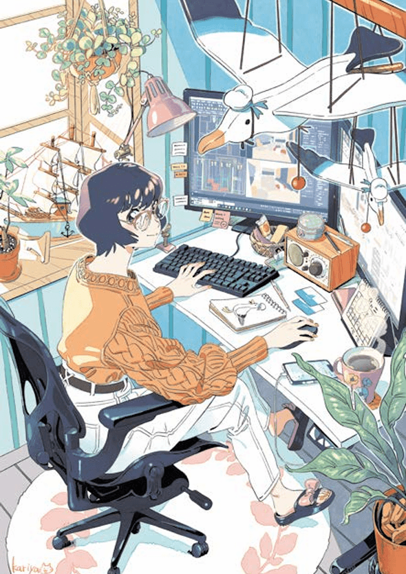 而被問到筆下的人物及房間是否有特定的參考對象,Kariya表示當她在電影、MV、攝影集和漫畫裡面看到覺得還不錯的房間構圖時,她會先畫下草圖,等空閒的時候再慢慢完成。對於未來,她期許自己能畫出更多「當下」腦海浮現的場景。