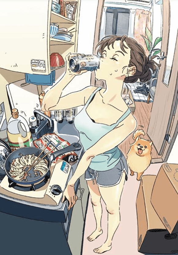 身為知名動畫師與插畫家,Kariya的作品總是帶著一種動態的生命力。深受「森林家族」玩偶影響的她,將布置生活空間的熱情延伸到了畫布上。在描繪單身女孩的小套房時,因為想營造出柔和的氛圍,她刻意捨棄死板的直線,改以微彎的線條搭配類魚眼鏡頭的廣角視角,不僅將狹窄的廚房與走廊盡收眼底,更透過指甲油等細節營造出獨居女孩的氣息。Kariya極度重視「生活感」的營造,那些散落在桌上的遙控器、水槽裡洗過碗的痕跡,以及事後為了增加空間寬敞感而補畫上的貓咪,都是她用來與讀者產生連結的關鍵。