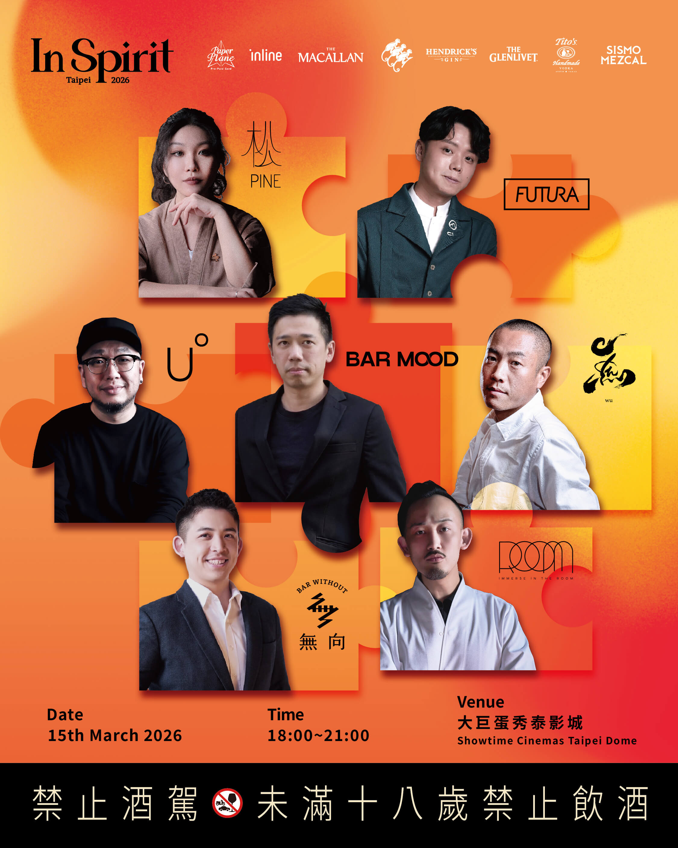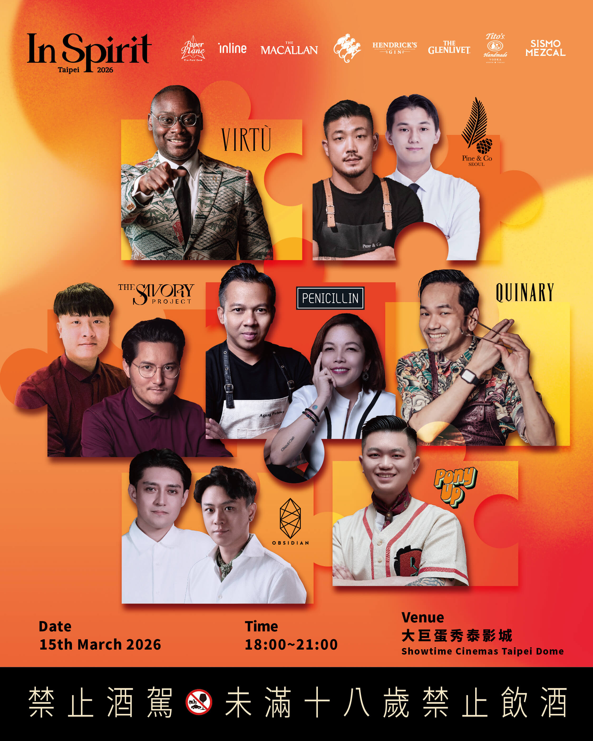 In Spirit Taipei 2026將於3月15日在台北大巨蛋秀泰影城登場。亞洲7間指標酒吧——香港Quinary、東京VIRTÙ、首爾Pine & Co.等——將各配對一間台北酒吧,聯名推出14款限定特調,僅活動當日供應。