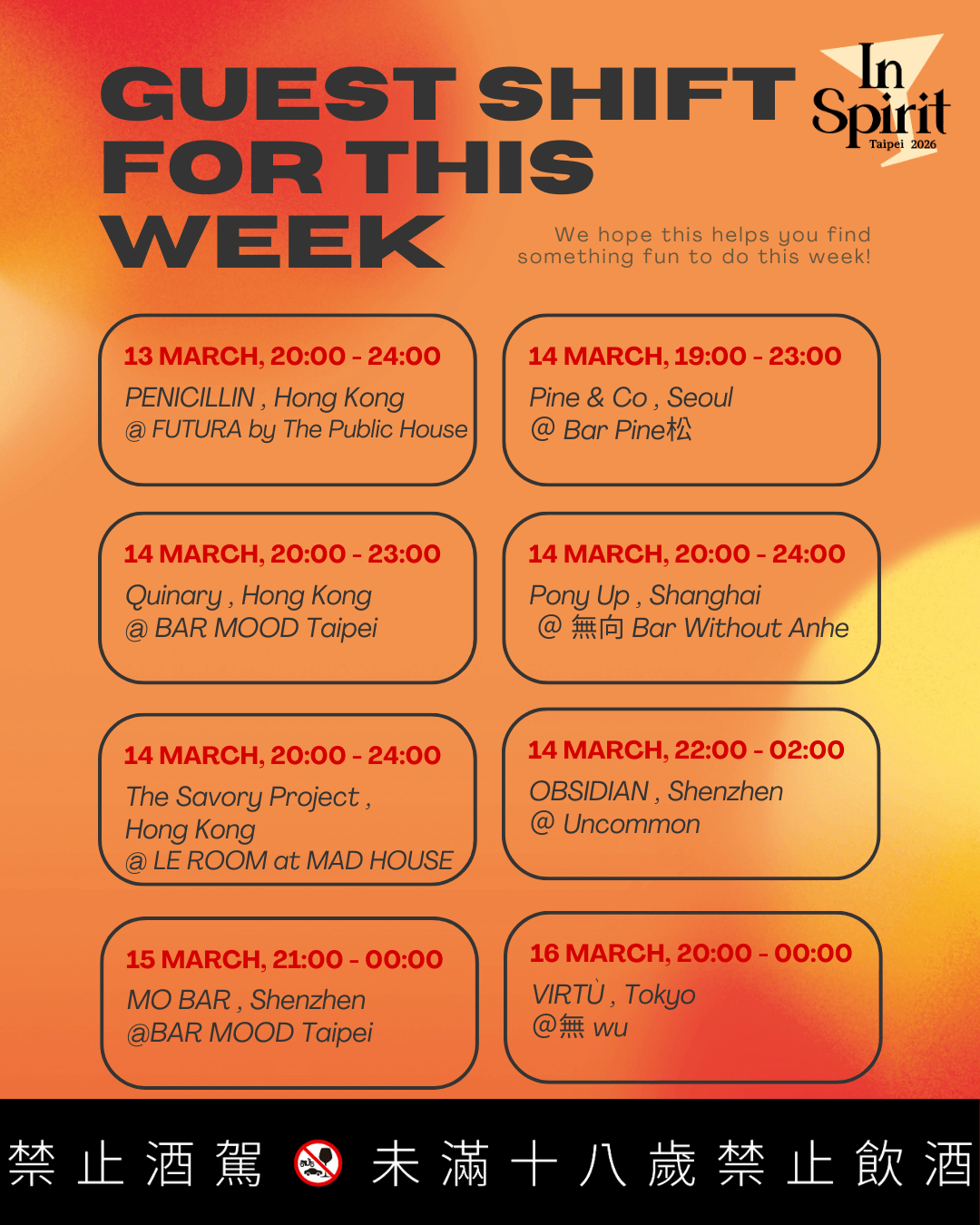 主場之外,In Spirit Taipei 2026 延伸至台北七間合作酒吧,共八場客座活動。來自各城市的國際酒吧進駐在地場地,在不同規模、不同氛圍的環境裡繼續這場對話。