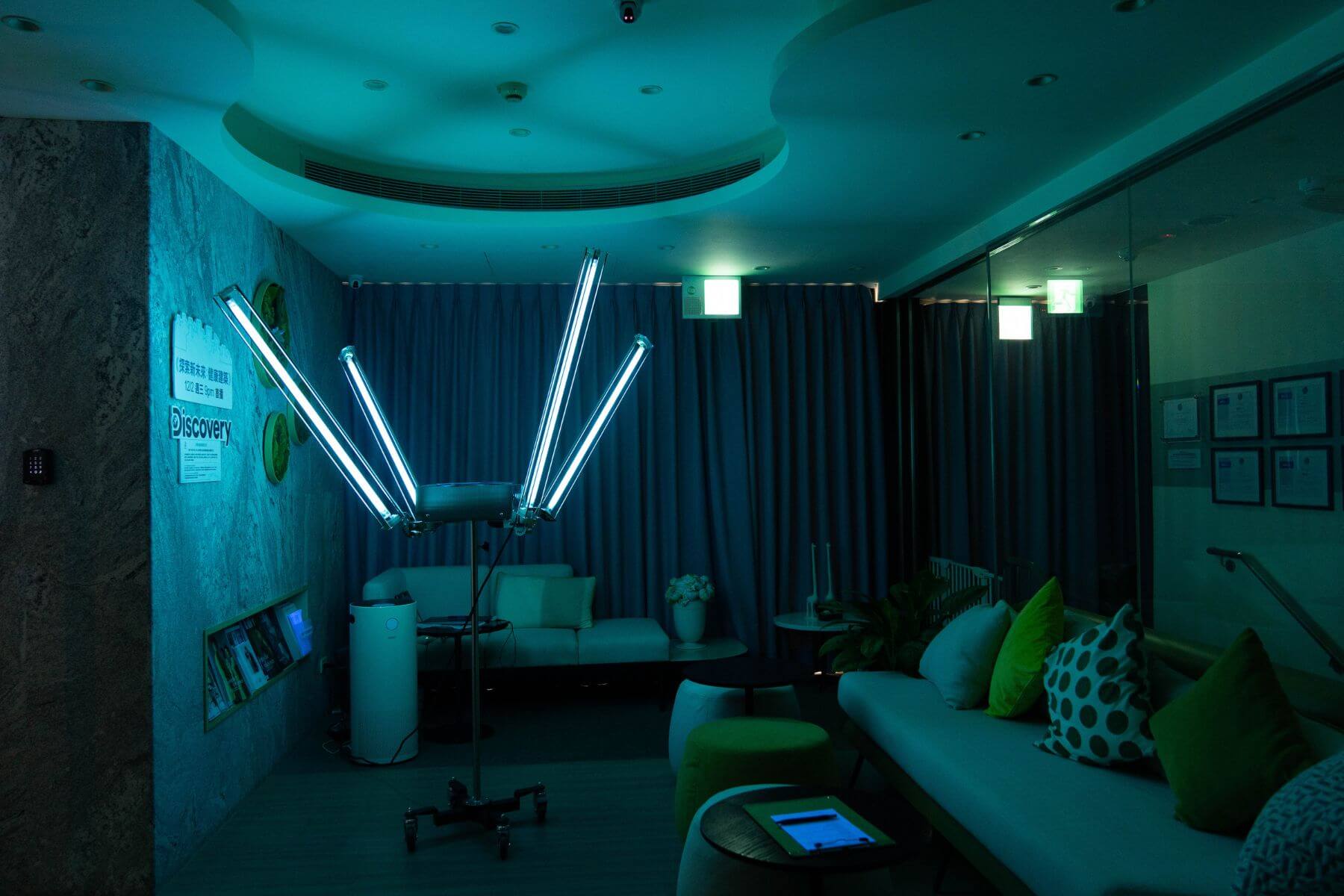 館內每日例行清潔後會再用ATP生物冷光儀和黑光燈檢測,搭配大型醫學中心專用的紫外線消毒燈定時消毒。