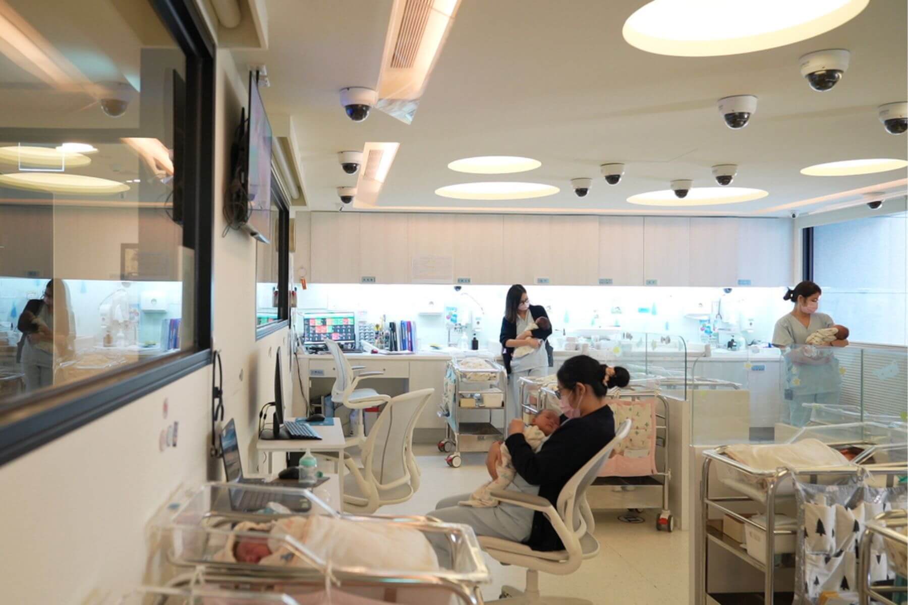 孕學林的專業團隊中,有獲得國際認證的泌乳顧問和營養師,護理人員們三班24小時提供輪流巡房,更藉嬰兒的電子腳環實行AI智能照護,一旦有睡眠、飲食、心律、體溫、呼吸等狀況低於正常值,他們都能即時知曉、應對。此外,孕學林也與知名小兒科醫師、物理治療師、瑜珈老師配合開課,每週帶來豐富多樣的課程供父母選擇,館內還有一處擺放多達兩千本繪本的空間,讓父母可自由閱覽親子教材。待在館內,即使是新手父母也不會慌亂無助。