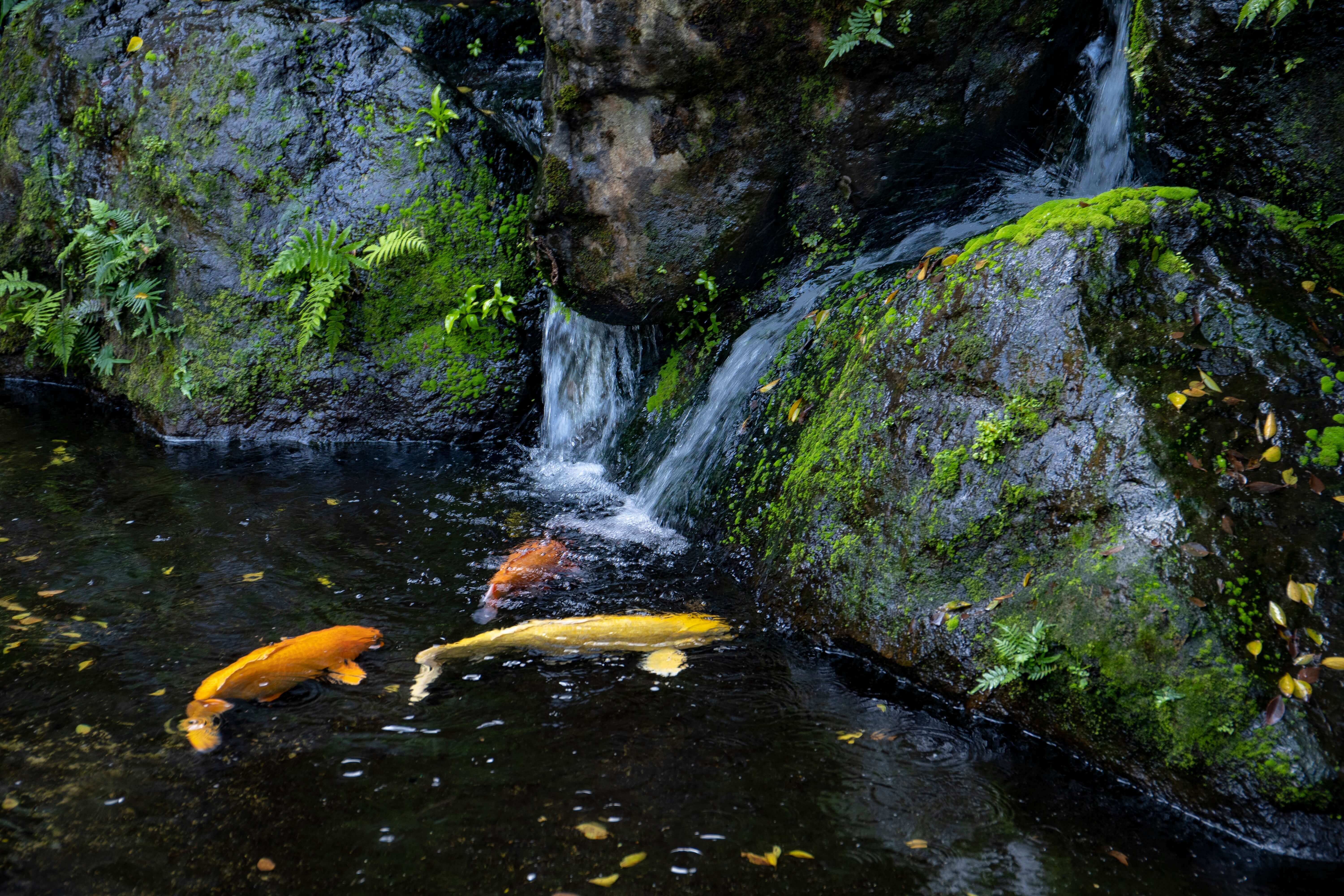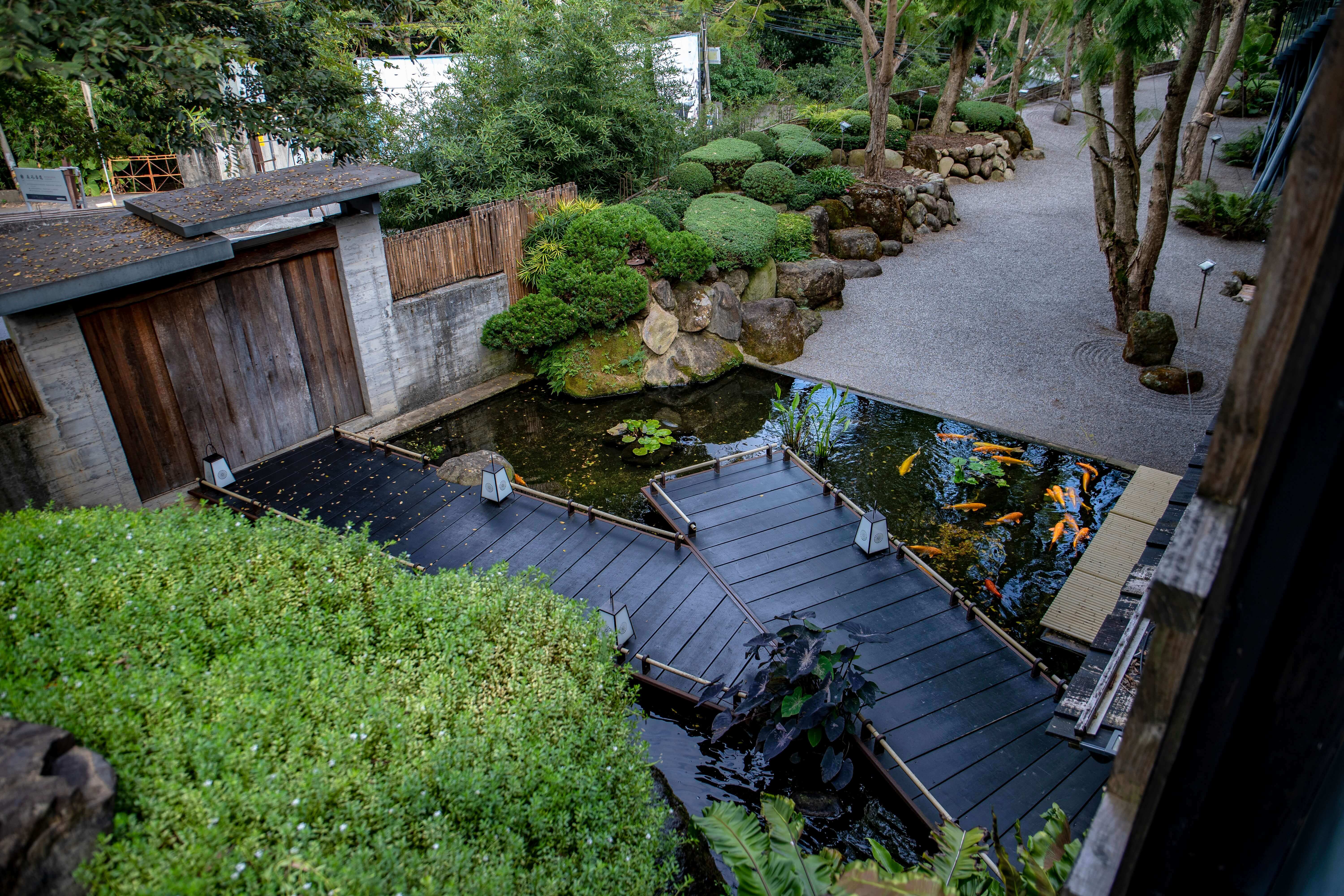 走進飛花落院,池子裡游著一群黃金錦鯉。牠們來自日本和泉屋養鯉場,是Sandy特別請「台灣錦鯉女王」鍾瑩瑩挑選的。鍾瑩瑩經常受邀到日本擔任錦鯉比賽評審,眼光自然不凡。五年前這些錦鯉來的時候還很小,現在被養得白白胖胖,在水井山水間悠遊。