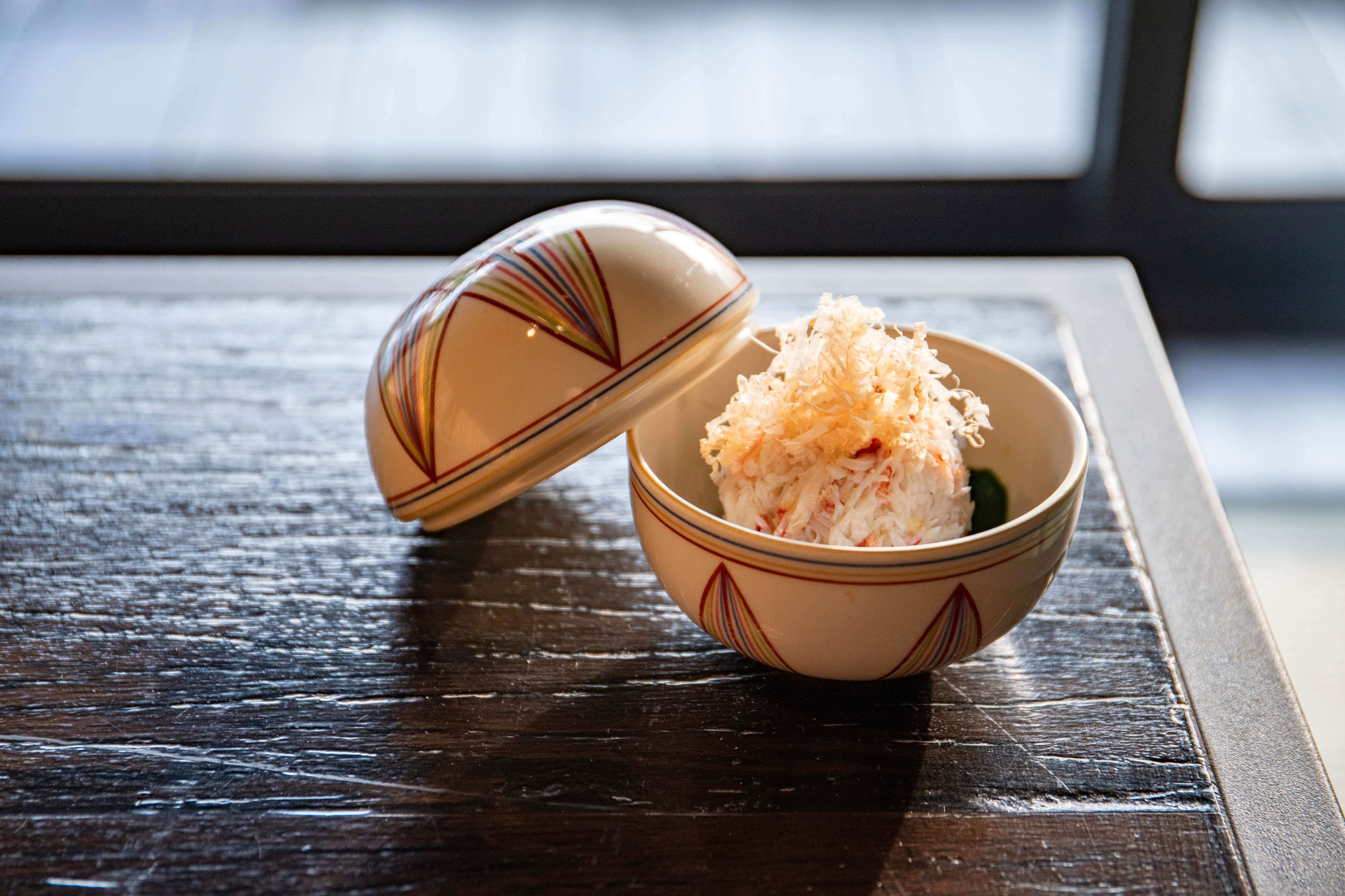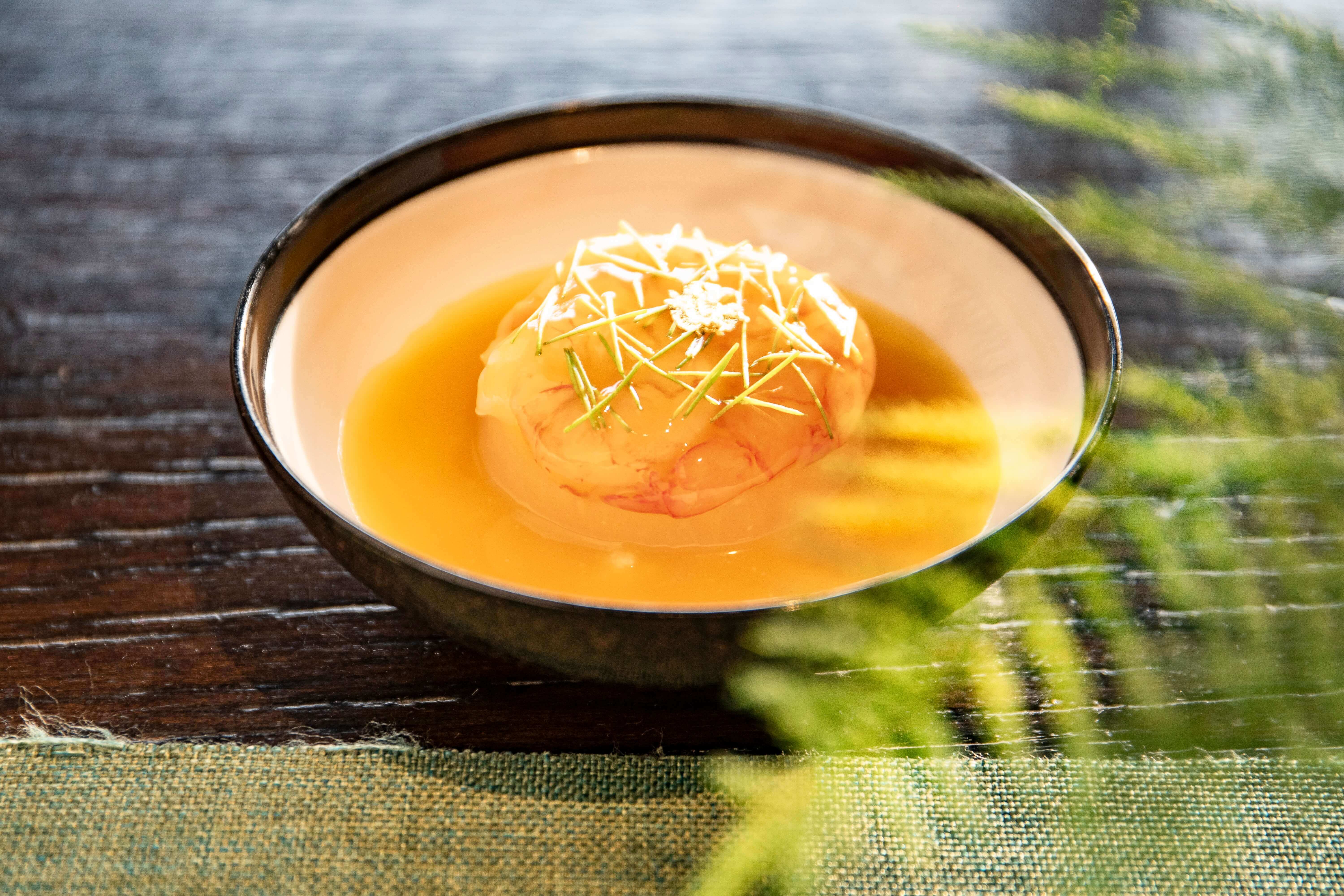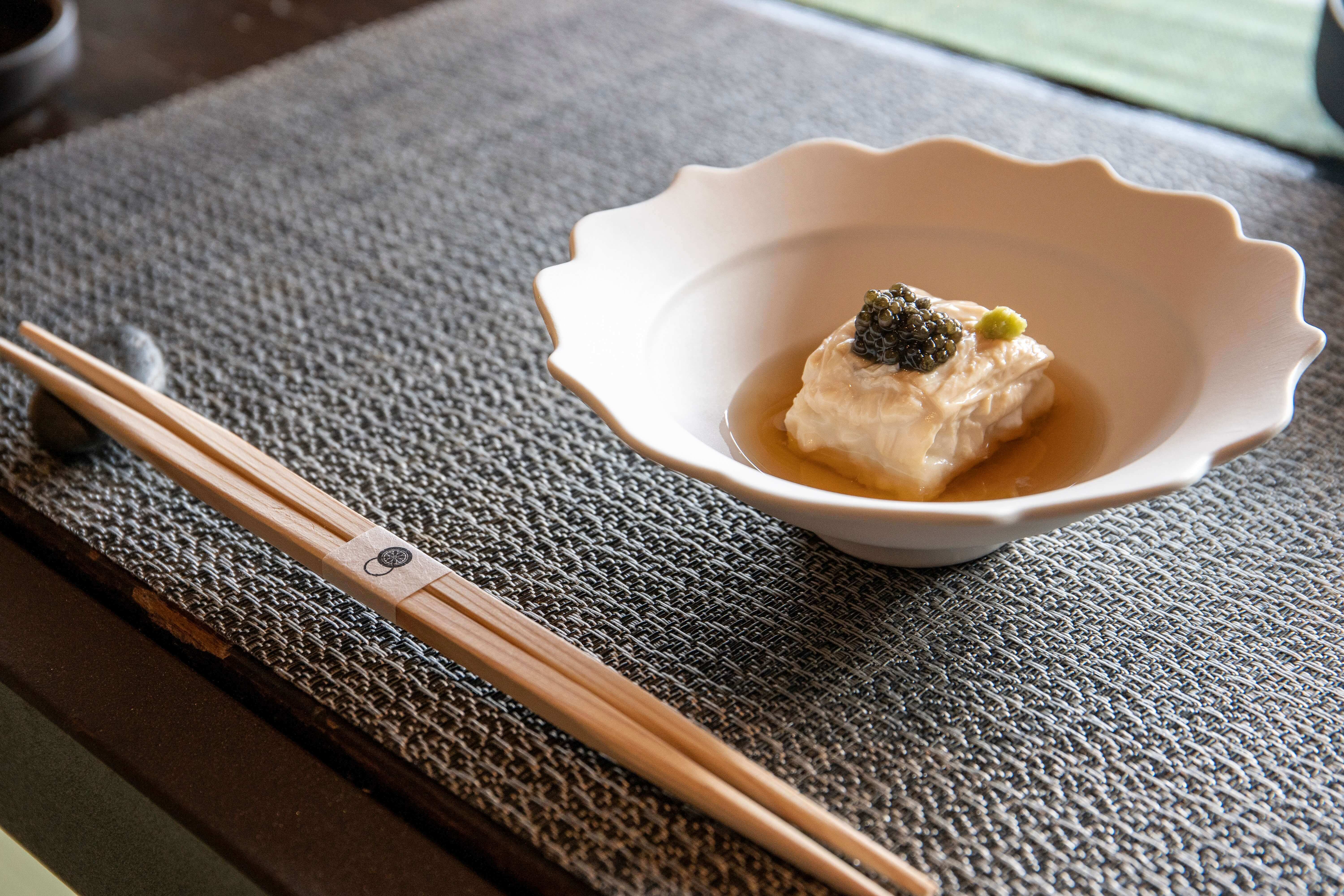 軟絲被切成細如麵條的絲狀,盤旋在刺身盤上,入口是驚人的綿韌,咀嚼時釋放回甘鮮甜。冬季魚類通常肥美,今日精選了兩種富含油脂的魚——黑鮪魚、白魽,與無油脂的軟絲和蒟蒻巧妙搭配,肥瘦相間。湯葉米豆腐以台梗九號米自製米漿,加入豆漿與鮮奶油,中間夾入絲綢乳酪,綿密滑順,像雲一樣在舌尖融化。搭配法國進口的魚子醬,鹹度適中,只留純粹的海洋鮮甜,在口腔裡停留的時間很長很長。