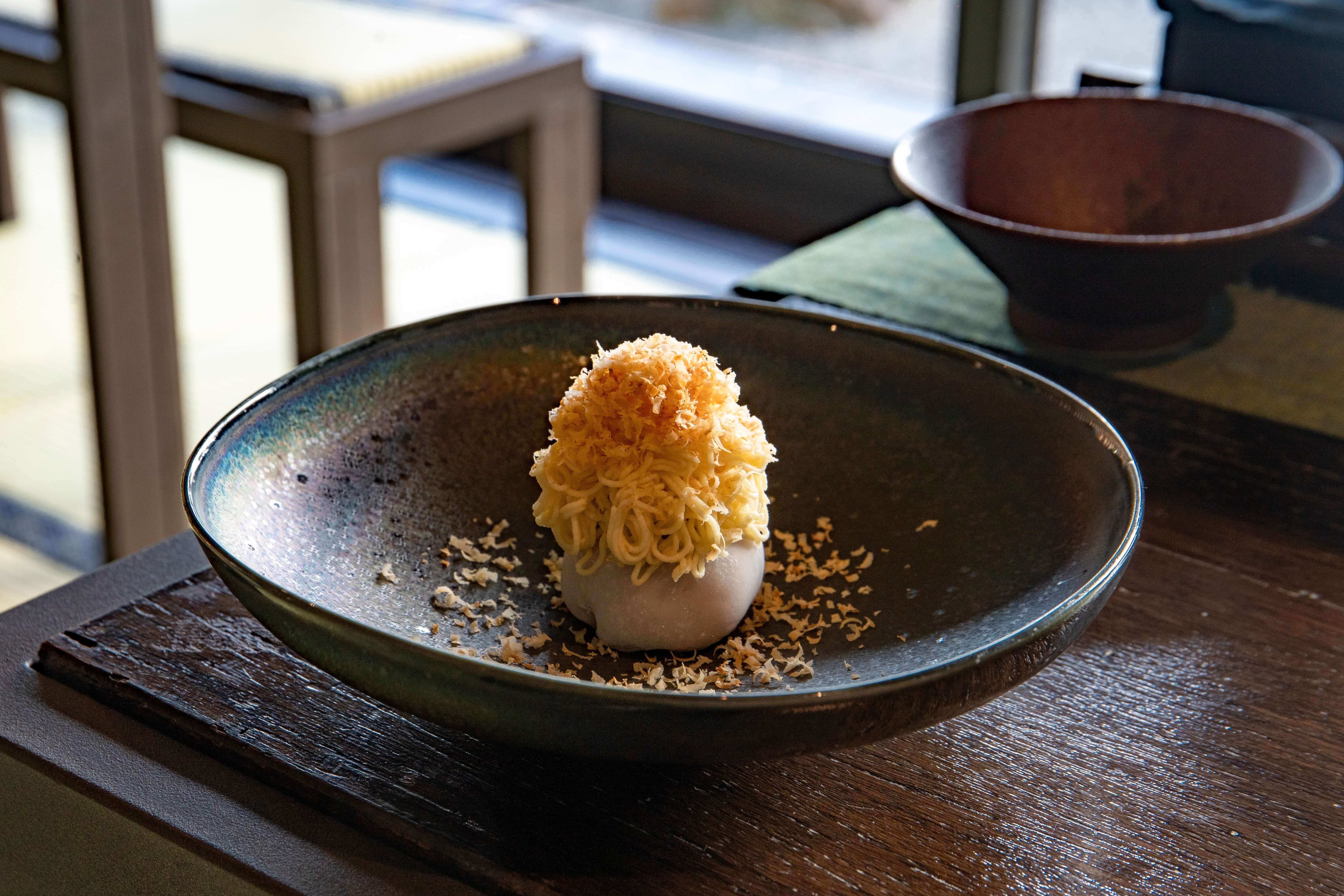 松葉蟹底部鋪著清境山區的塔菇菜泥,蟹肉球內包裹著綿密的馬鈴薯泥,淋上帶有黃檸檬油的醬汁,清爽酸度切開蟹的鮮甜。洋蔥麵以冬季盛產的洋蔥為主軸,搭配綠色的蔥油、蝦夷蔥和烤過的蔥白,散發濃郁的蔥香與洋蔥的自然甜味,麵上撒有風乾炸製的伊比利火腿粉。主廚特別提醒:「這個要大口大口吃!」只有大口吃,麵條才能帶著湯汁一起滑過喉嚨,那種從喉間升起的味覺層次直達鼻腔,才是這道菜的精髓。