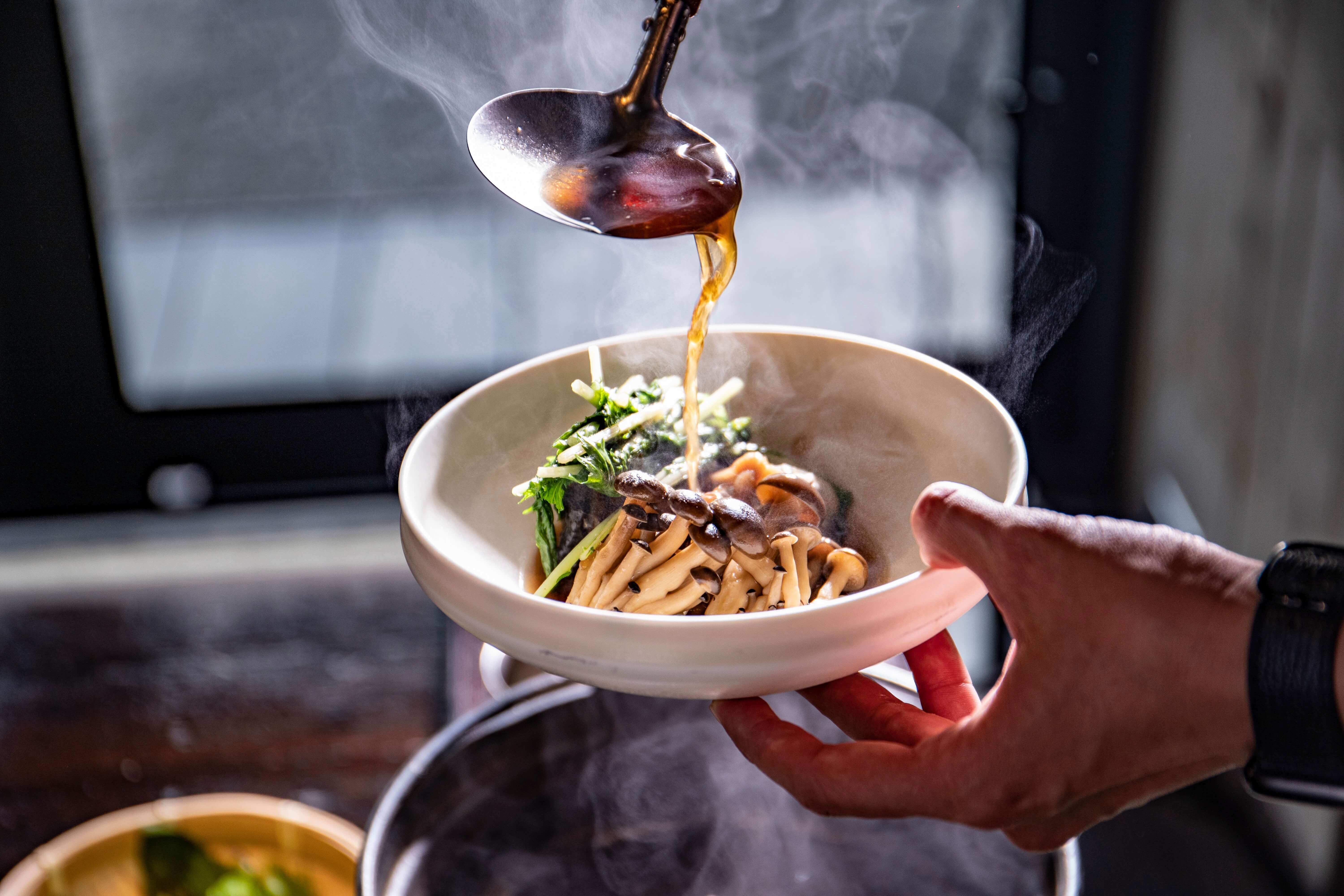 最能呼應「保存食」主題的黑金牛肉鍋湯底選用老菜脯,熬煮出醇厚回甘的鹹香。鍋中加入烏骨雞,並以高麗菜包裹翼板牛肉。釜飯採用獨特烹飪方式。「一般的釜飯對我來說味道太淡。」主廚說,「在飛花落院我們直接用水跟米煮,飯煮好之後才下去調味,然後再悶一下。」鵝油拌飯的獨特香氣與米飯的焦香完美融合,玉米也以鵝油烤出濃郁甜香。