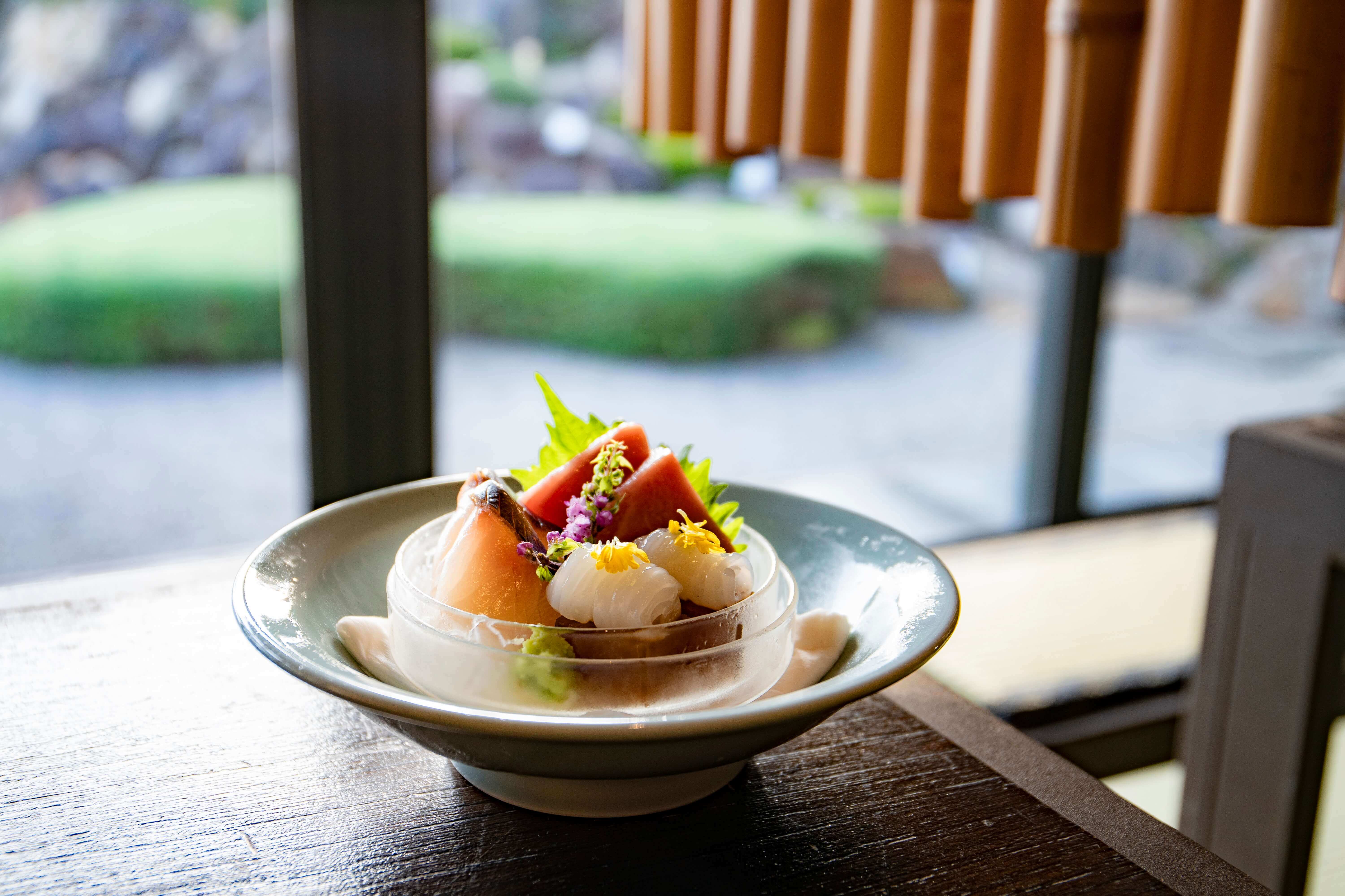 傍晚4點半,夕陽會從西邊灑進來。光線在飛花落院是一件大事,入席前的展間還懸掛著來自義大利、現定居金澤的Origo主廚Matteo Alberti攝影作品,現實的光影與影像中的光形成某種對話,只是相片凝結了時間,而飛花落院裡,光始終在移動。