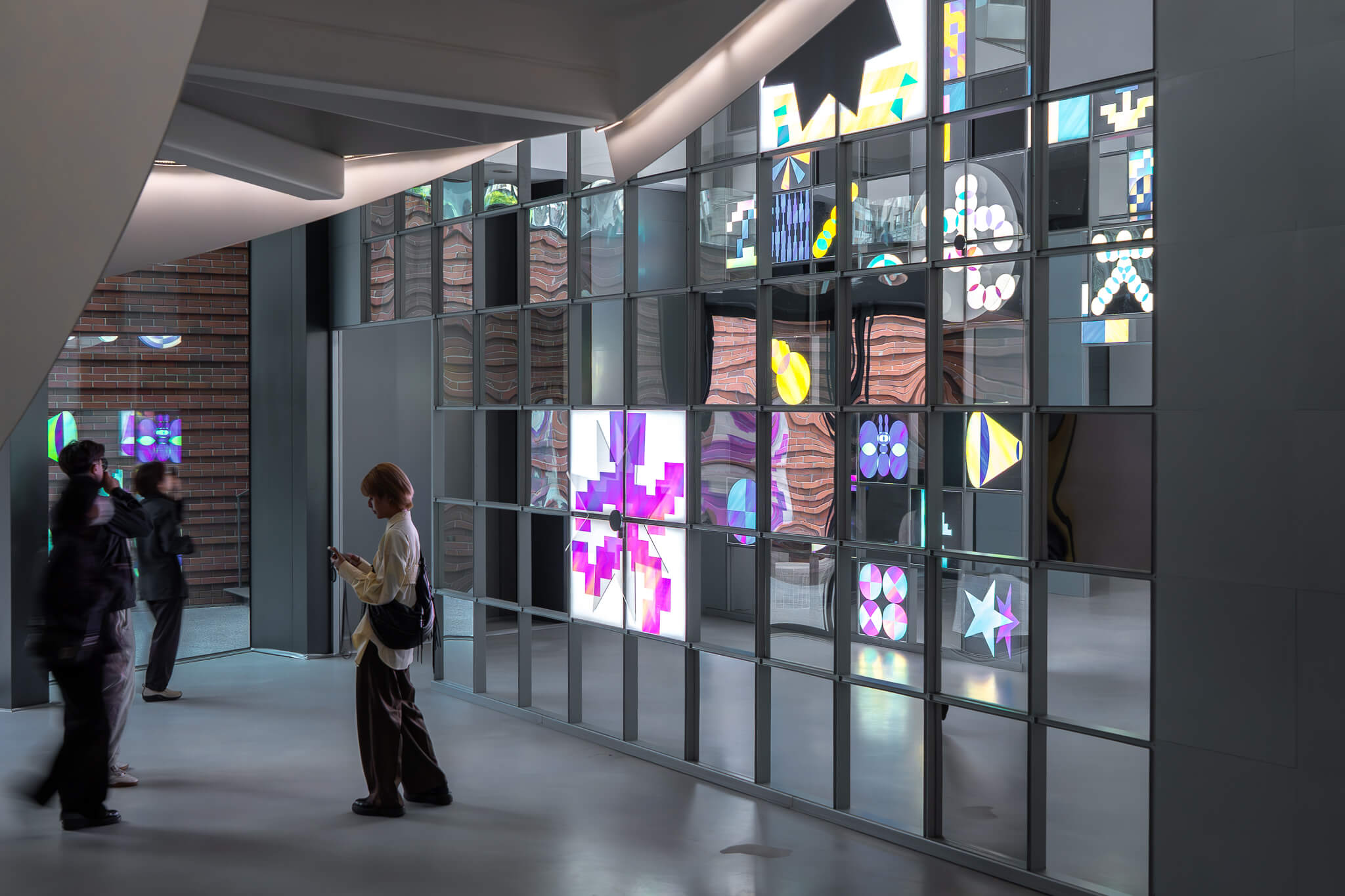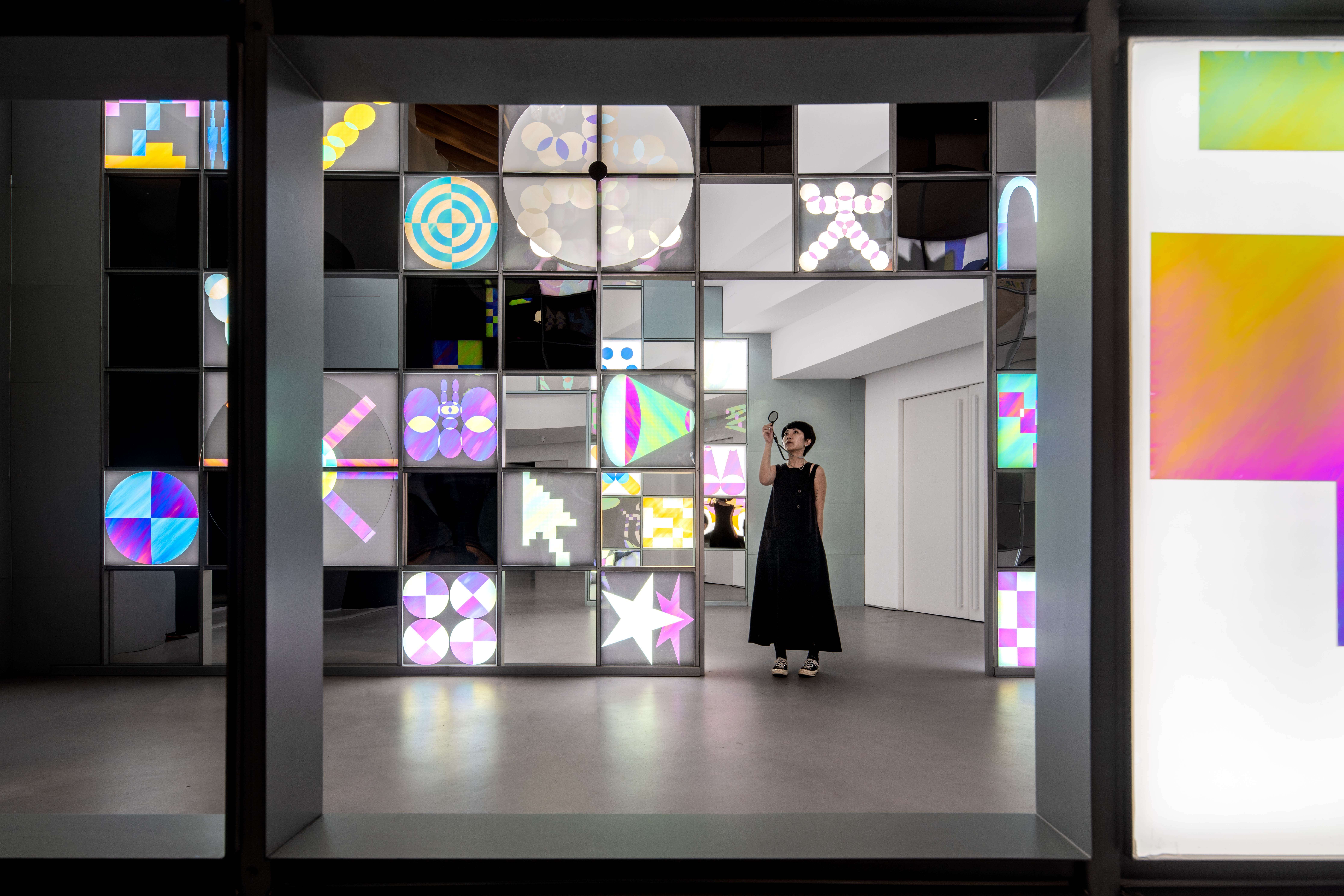 順著階梯走入地下一層,《像素力場 Dynamic Field》以流動光影迎面展開。裝置由偏光鏡面、旋轉機構與燈光交織而成,構築高達七公尺的可步入像素矩陣;隨觀者移動與視角改變,層層色層、反射與光譜相互顯影。