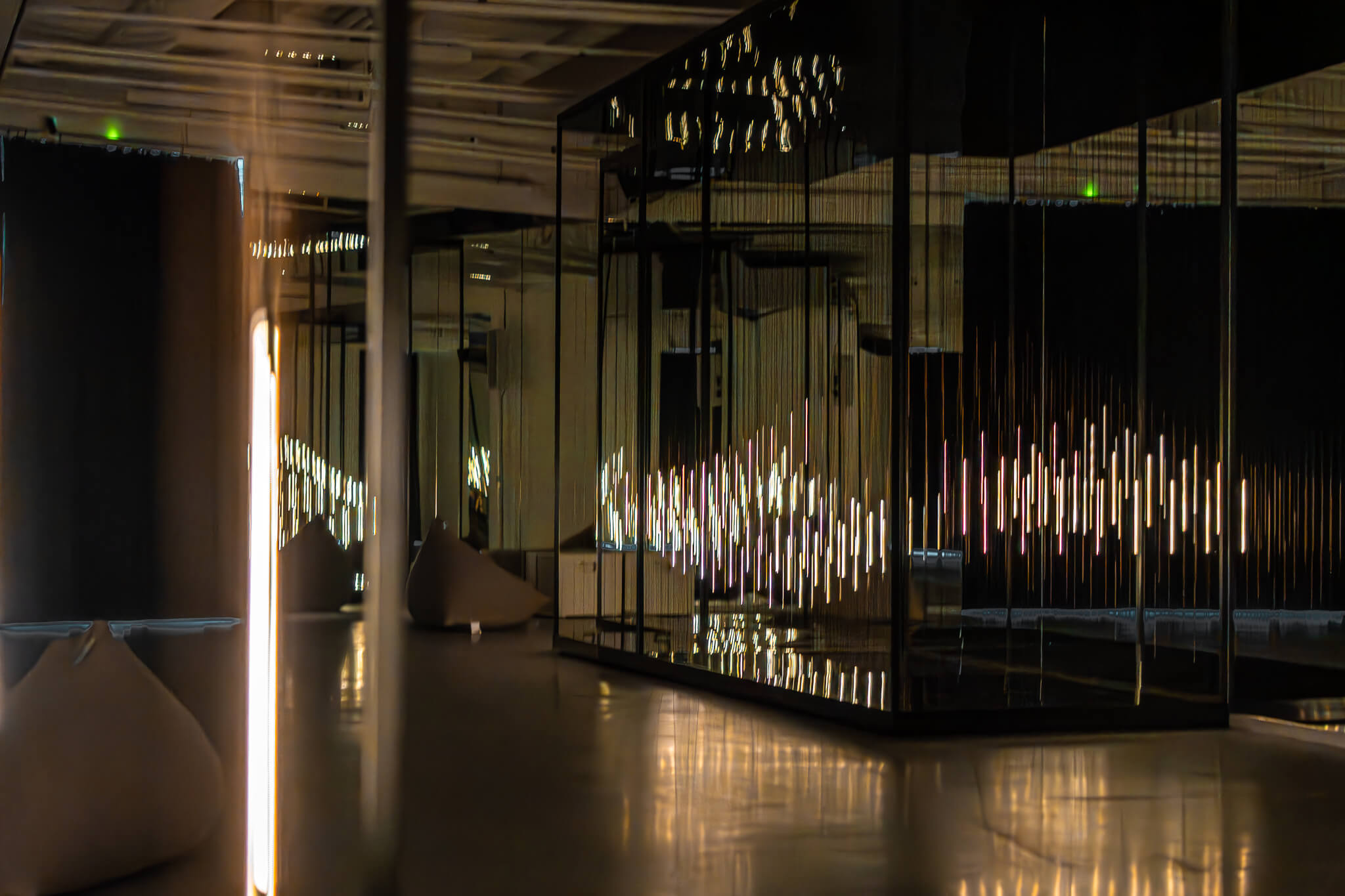 移入暗黑場域,《海境:回溯 Tender Soul of Ocean: recall》由何理 WHYIXD 與德國 KLING KLANG KLONG共同創作,以戶外氣候資料與人流數據轉譯為動態光影與聲音。