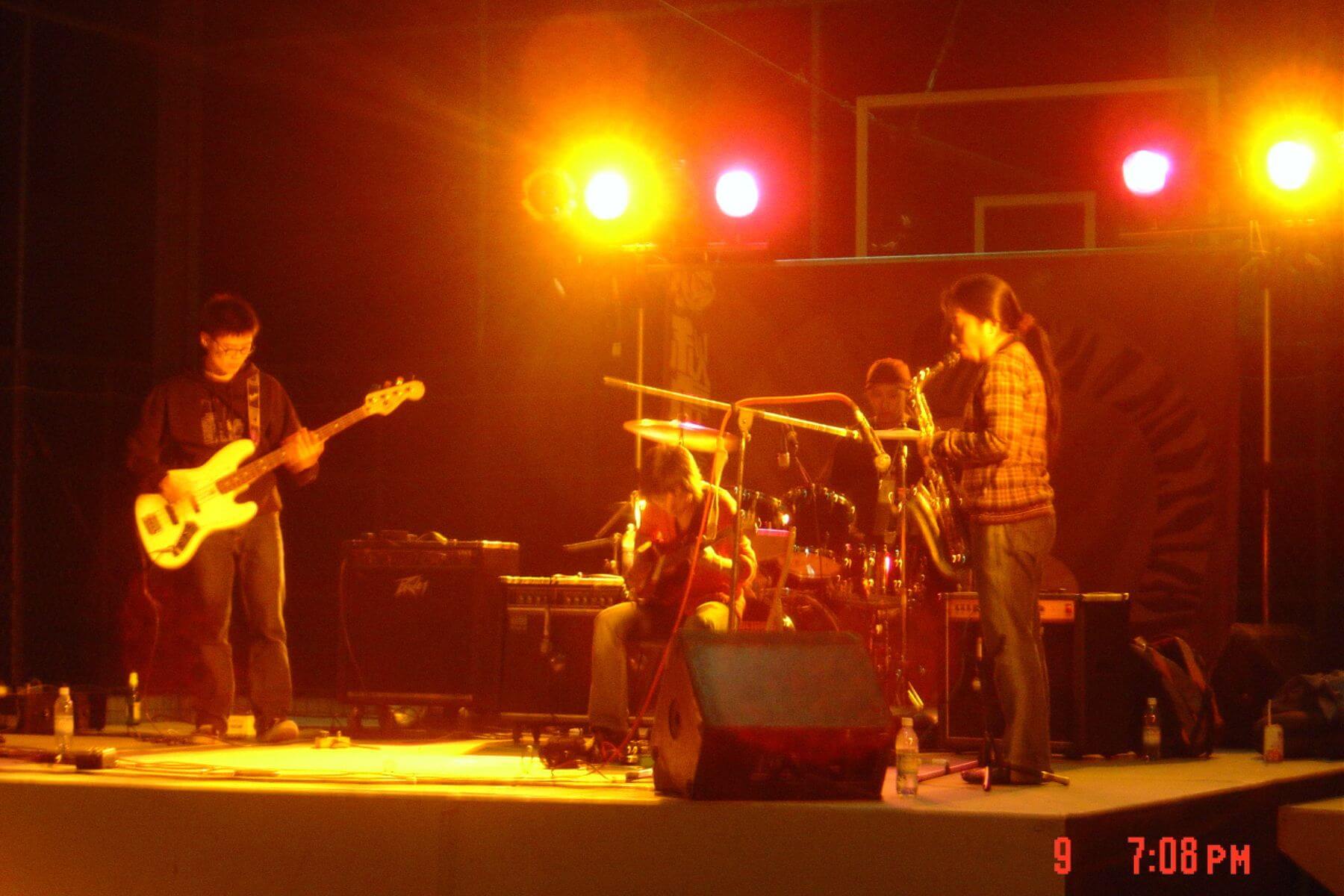 1997年12月14日,甜梅號前身樂團 @ 台大校門口。舞台由左至右:小白、佑子、鄭鏗彰、葉子。(圖片提供/昆蟲白)