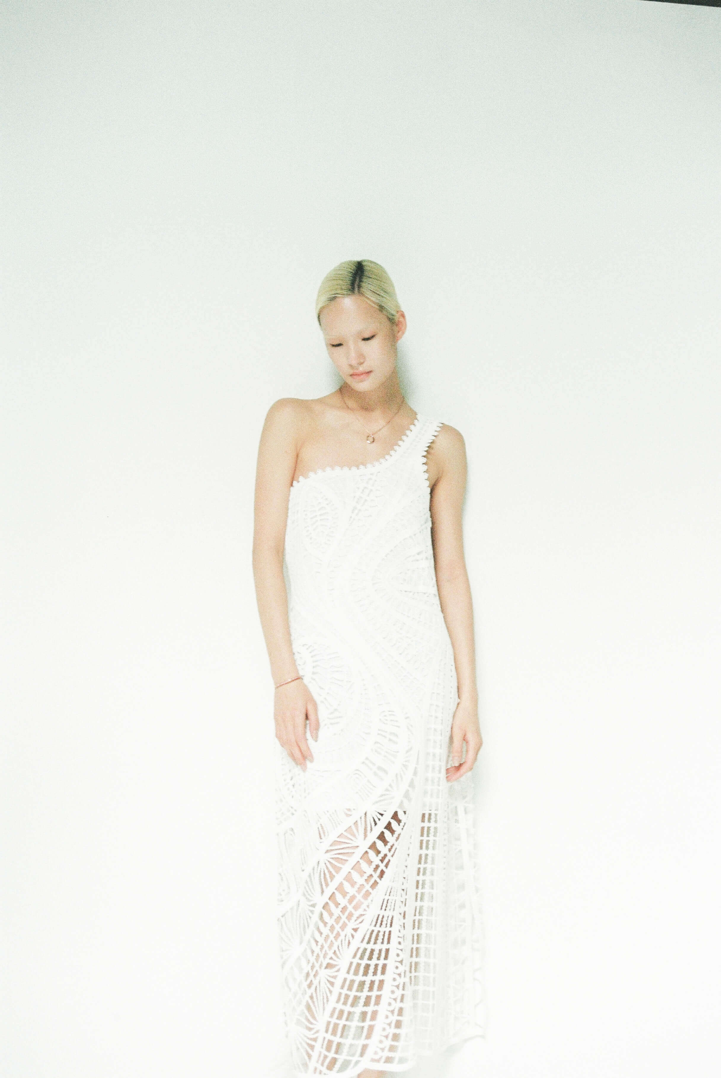 Tiffany Lock系列18K玫瑰金鑲嵌粉色藍寶石小型款項鍊、Tiffany Lock系列18K玫瑰金手圈、Maje 白色不對稱鉤編連身裙。
