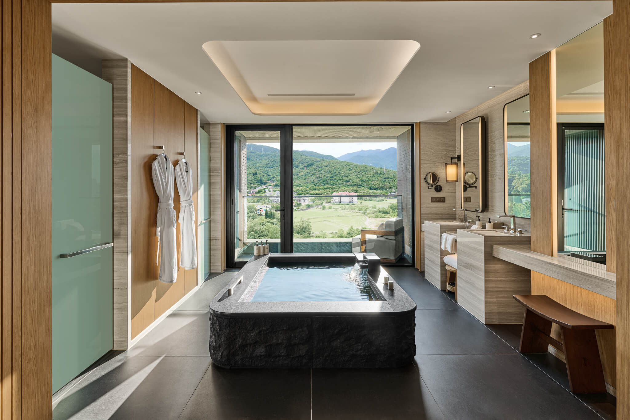 從豪華房到單臥套房,從映岫套房到總統套房,房內的泡湯池都以寬敞舒適為設計核心。入冬後的金山,山風帶著些許涼意,正是泡湯的最佳時節。褪去一身疲憊,浸入溫熱的泉水,透過落地窗望向遠方的山巒,那種「除去只有自己才懂的壓力」的釋然感,是這座酒店最珍貴的禮物。