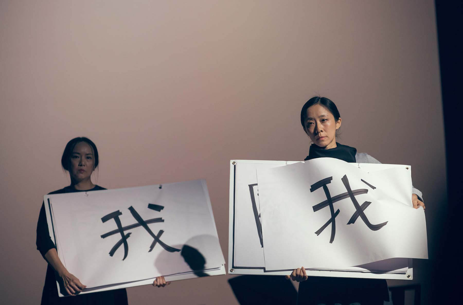 承上,許多章節的表演都有雙聲、複聲,有些是粵語與漢語同時並行,伴隨著速度如同誦唸般將時光接引至下一處所在(例如有一段間奏,兩位表演人撕著空白字卡,好像撕日曆似的將時光推進至,從回歸前到回歸後,隨即進入張國榮的篇章),想請問如此表演手法是否有特別的意涵?或是有其他文字無法傳達的困難之處,反而在舞台上較好發揮?
