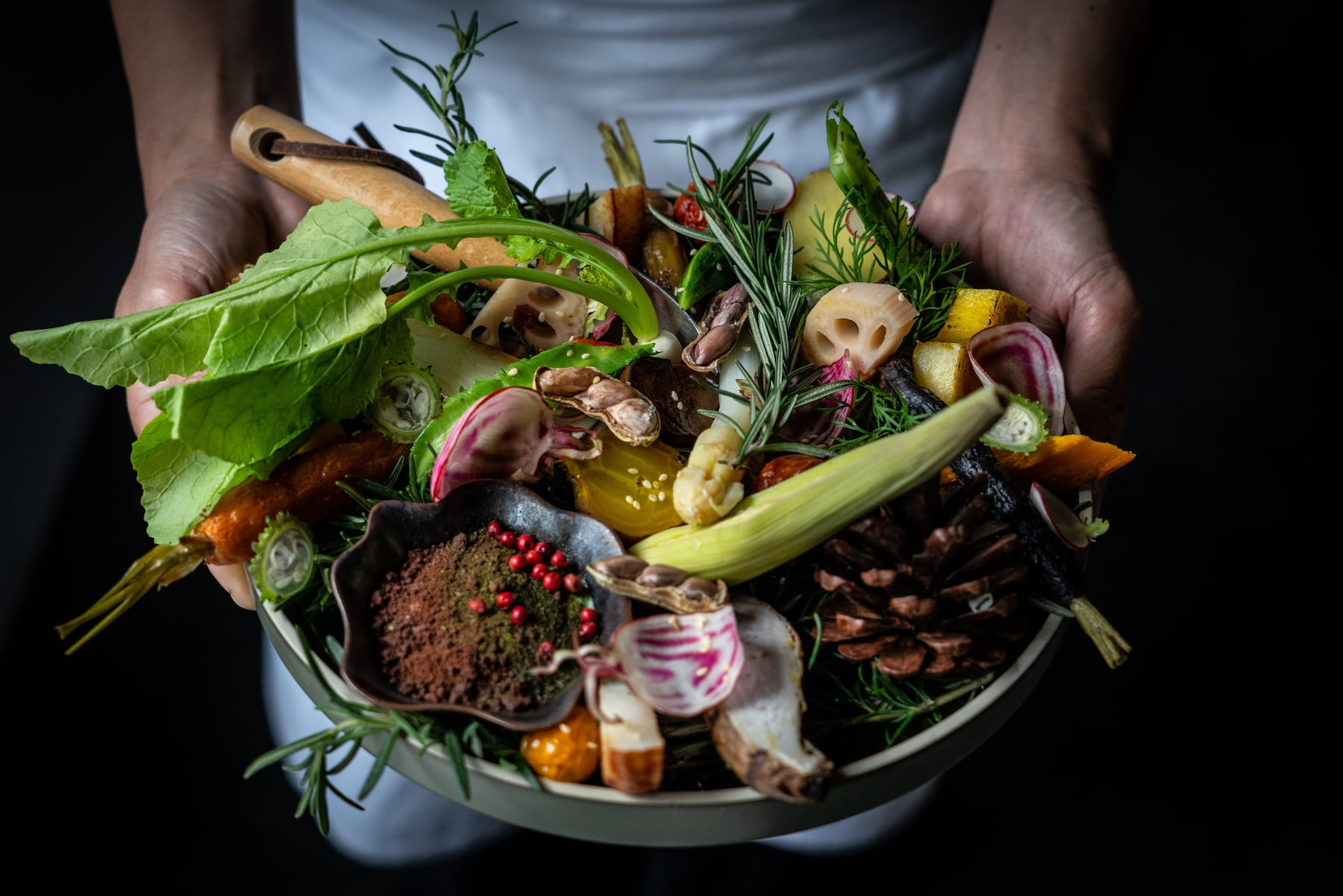 「我喫了一座森林」打造餐桌上的城市綠洲,把過貓、山葵、馬告等在地特殊香草,包入特製的圓形苔癬脆餅中,打造充滿森林感的料理。